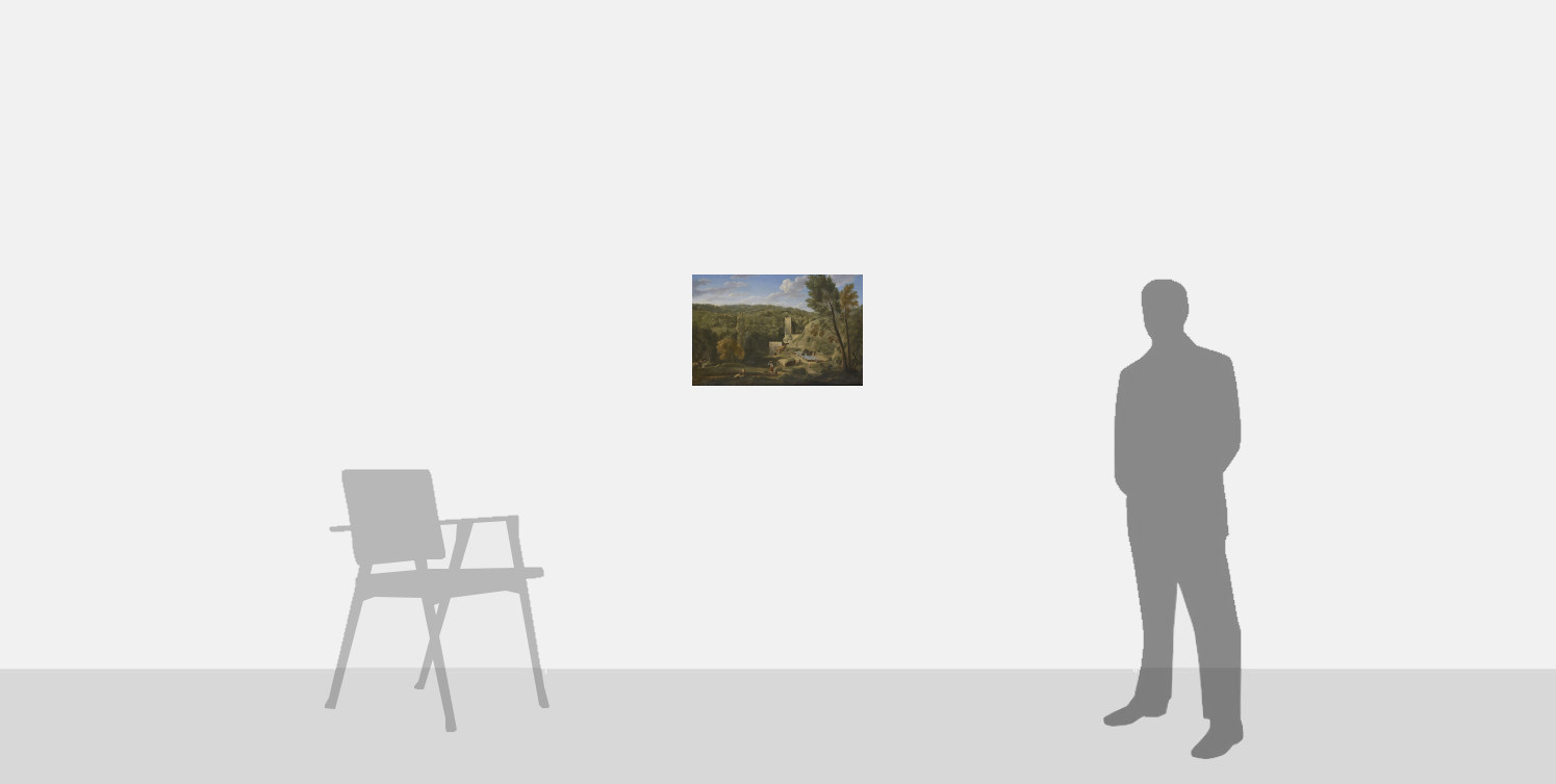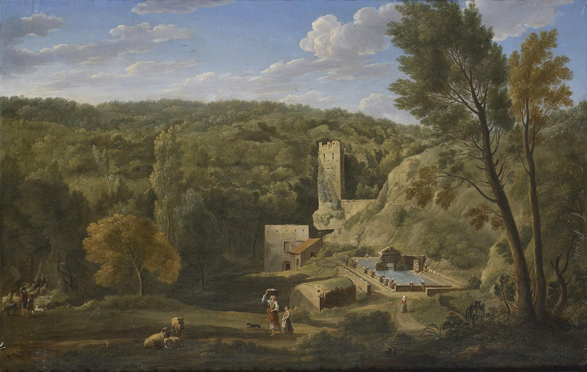 Van Lint also held a deep admiration for Claude Lorrain, whose work he could easily have studied in numerous Roman collections. Van Lint’s nickname, Monsú Studio, may refer to his meticulous technique, which he modelled on the great master. Like Claude, Van Lint would make detailed drawings in pencil, pen, and wash, often en plein air, during his frequent expeditions to the countryside around Rome. He would then use these preparatory drawings to work up full-scale compositions on canvas, often adding ruins and classical buildings to create elaborate imaginary landscapes in the style of Claude, with their gently suffused light and tranquil air of antiquity. Indeed, Claude’s painting in the Museo di Capodimonte, Naples, of 1669, is the source of inspiration for this landscape; the picture was still in the collection of the Colonna family in 1787, where Van Lint could have studied it.