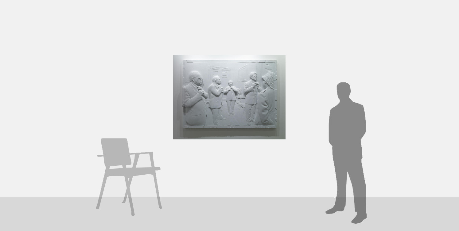 The Travelling Players is a bas-relief in white Carrara marble based on a photograph showing the signatories of the Oslo II Accord (September 28, 1995) just before they emerged to make their speeches. On publication, this unconventional picture of the five negotiators had a distancing effect, exploiting the backstage comedy of a situation in which, despite the gravity of the moment, everyone is checking their ties. Itzhak Rabin, Hosni Mubarak, King Hussein of Jordan, Bill Clinton, and Yasser Arafat prepare their entrance onto the stage of history, announcing a long-expected and decisive peace treaty. They have come to an agreement despite their differences, a point visually referenced by their identical gestures. Twenty years later, the transposition into marble of the photograph represents first and foremost a monument to the failure of the accords; Itzhak Rabin was assassinated barely two months later. Since antiquity, panels of low-relief sculpture have been a traditional way of depicting official history. Thus the photograph loses its ephemeral character even as the perfection of its construction comes to the fore: the king is at the centre, Rabin and Arafat are on the sides, and Clinton turns towards the off-screen space (here, the true stage). The stone image enhances the iconic value characteristic of any media image. However, the chronological distance between the two images has demolished this icon’s monumental pretensions by demolishing the fate of each of the protagonists, all of whom have since died or are no longer in power.