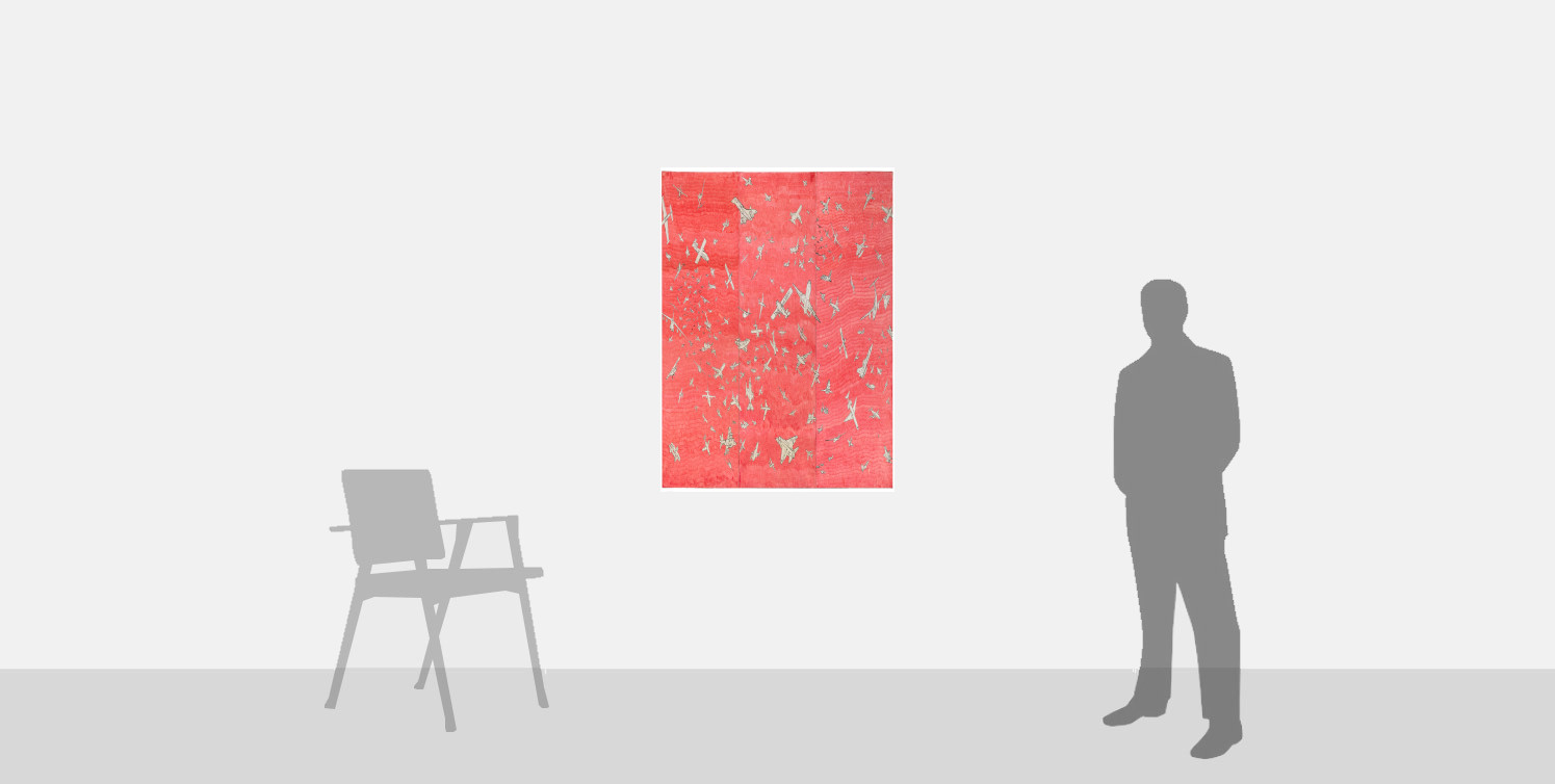 But in Aerei, the study on conceptual contrasts does not end here, as the artist pushes the more reflective gaze of the observers to a biunivocal or, more precisely, bipolar analysis, on time and space, which are two elements on which the artist's research and expression are more concentrated. In fact, in front of Aerei we notice how the apparent uniqueness of the conception of time is actually child of a tension generated by two opposing forces: on the one hand there is the dimension of possibility and freedom of the infinite, expressed by the several routes and by the incalculable destinations that the numerous planes depicted in the painting can travel and reach; on the other hand we perceive the rigor and impossibility of the limit, defined both by the material "boundaries" of the pictorial surface - which, being delimited in turn in three panels, interrupts and separates not only the future routes not yet travelled but also the planes and the sky space that are already present and immediately visible in the work - and by the technique with which the artist represents the sky, which, defined and coloured with a repetitive and almost geometric hatching, gives shape, and therefore sets a limit, to the airy atmospheric abstractness.