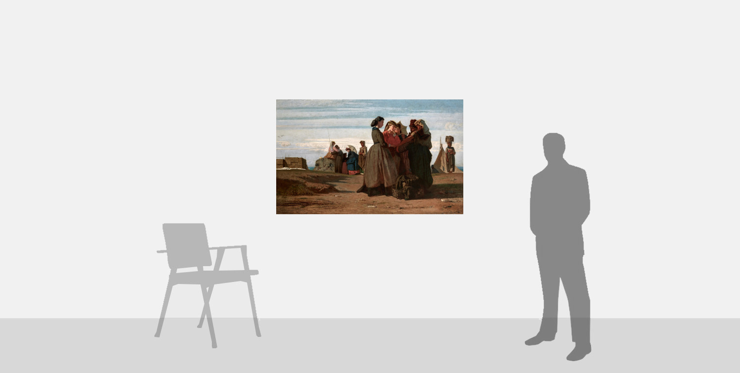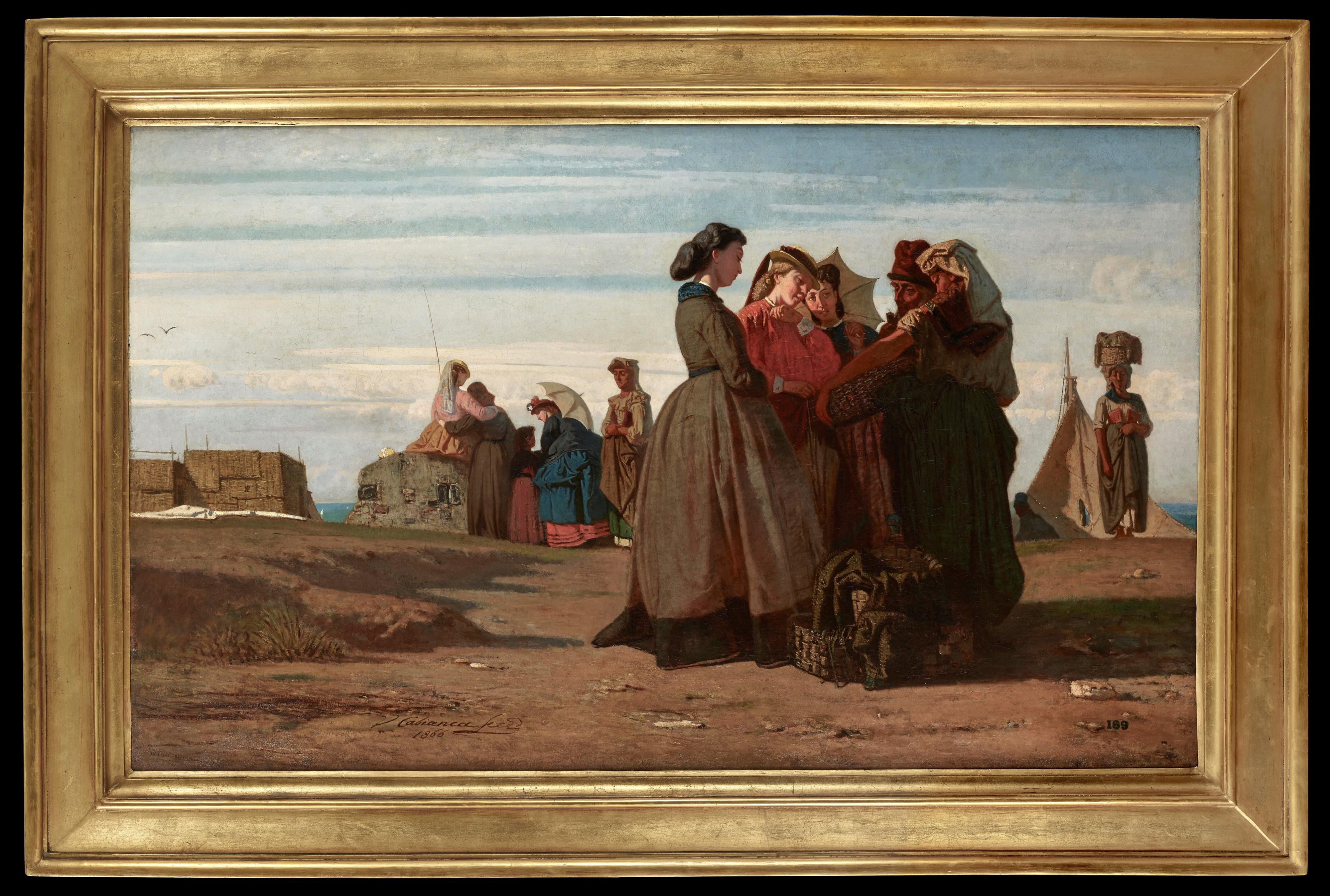 A different air is breathed in the two paintings of the following year, Al sole (private collection, fig. 6) and our Ai bagni di Viareggio. Here, the beach, which Cabianca again chose to represent in its wildest and most picturesque aspect, is traversed by elegant female figures dressed in the latest fashions of the day. In this work, the teachings of the Barbizon painters are absorbed into a completely personal language, made up not only of patches of colour but also of delicate passages of light, with a modernity that anticipates by a few years the famous innovations of Édouard Manet. The group of women engaging with the sellers in the foreground are reminiscent of Courbet’s paintings, situating contemporary figures in a landscape, for example Young Ladies of the Village (1851-52, fig. 7), now in The Metropolitan Museum of Art, New York. While the French painter – whose paintings were often motivated by contemporary issues and offered somewhat subversive commentaries, unlike the Macchiaioli – was not one of Cabianca’s main direct influences, the younger artist would likely have encountered such paintings by the renowned realist during his trip to France in 1861.