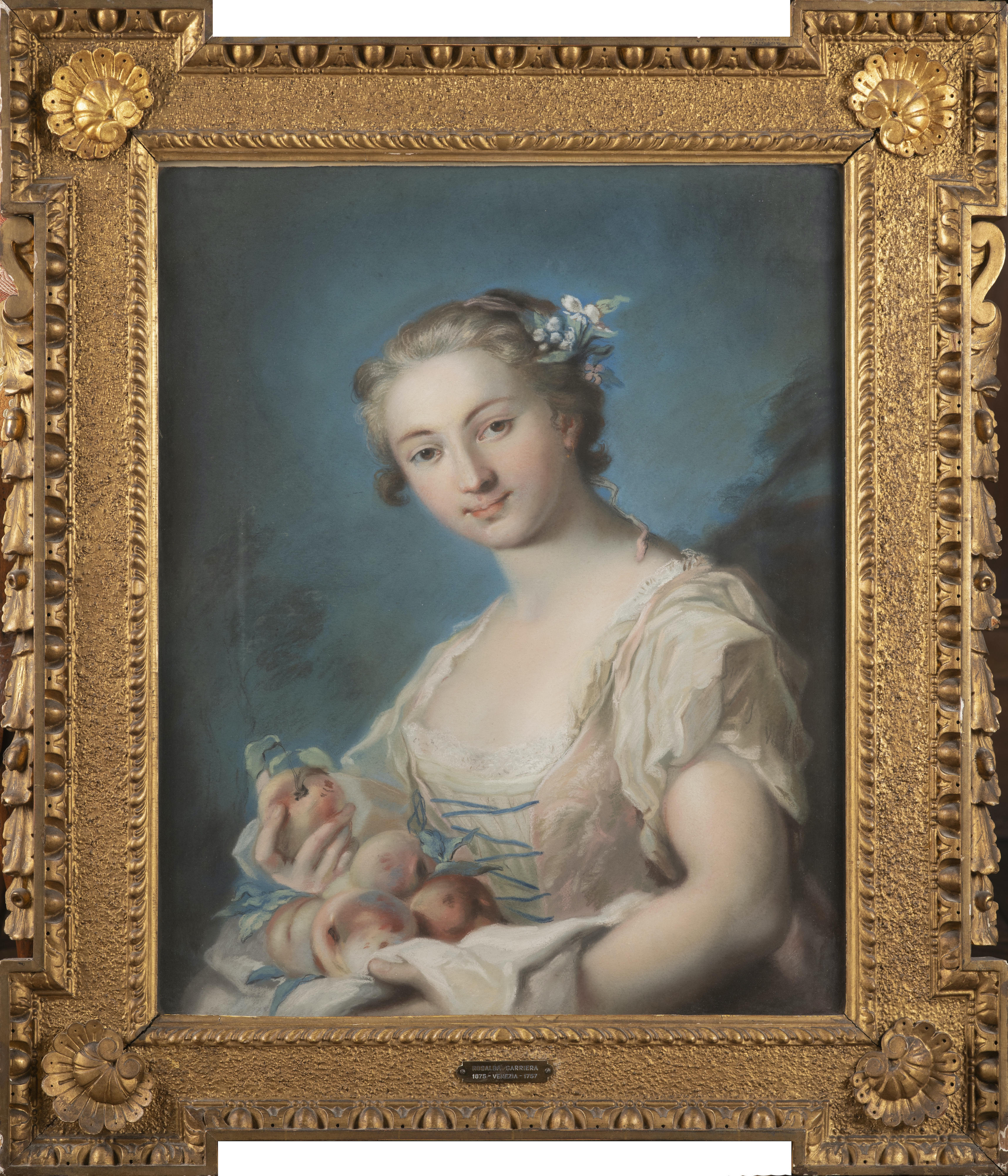 Summer is a unicum owing to its iconographical inventions, not found in any of Rosalba’s other versions of the series. The young woman, with a playful, knowing smile, holds a bunch of peaches encircled in a white napkin, as if she were proffering them to the beholder. The attention to detail in the representation of the fruit’s skin is particularly sensitive, while the leaves springing from the fruits enhance the sense of painting’s depth. The lace adorned dress is enhanced by Rosalba’s painting technique, which carefully articulates the innumerable folds of the costume.