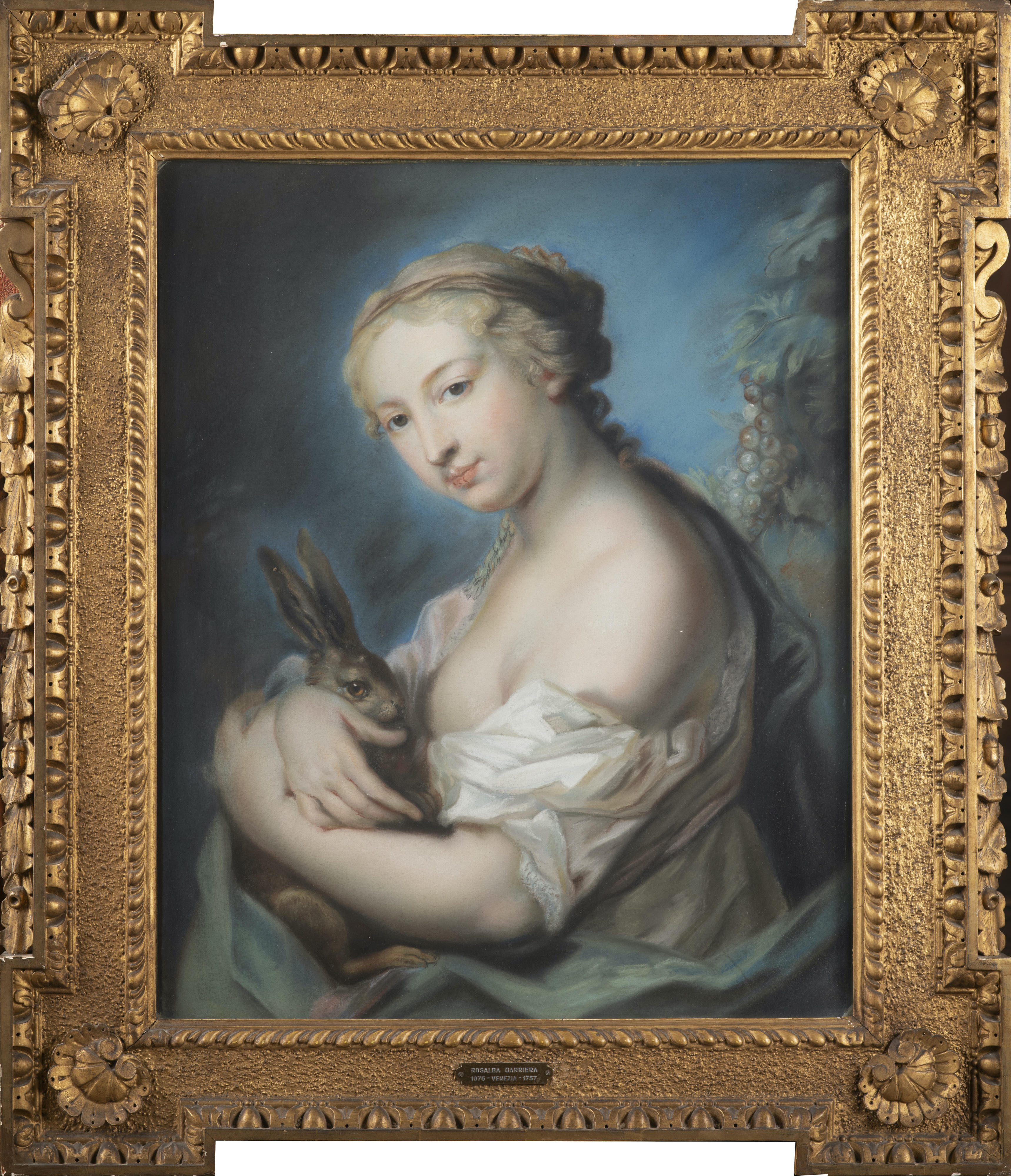 Much as in Rosalba’s portraits of women, the allegorical figures are rendered in graceful yet sensual poses, and a great deal of attention has been lavished on the representation of the fabrics. The draperies, pearls, and lace embellishments glow in the vivid light in which they are rendered, as do the fruits, flowers, and the especially fetching rabbit featured in Autumn, which huddles in the figure’s arms. The skilfully turned pose of Autumn enhances the depth of the scene, while her pale skin and blonde hair create a dramatic sense of chiaroscuro against the dark blue background, into which the grapes at right seem to delicately blend.