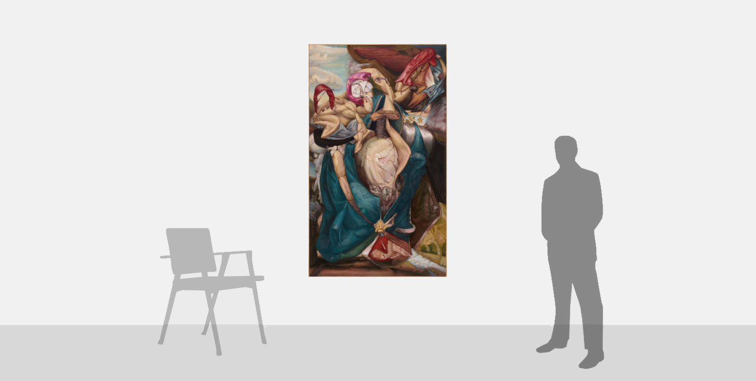 Santos’ inspirations are drawn from the more awkward or subversive corners of art history, such as Old Masters who were the eccentrics of their era, such as Giuseppe Arcimboldo, or those whose style was at odds with conventional beauty, such as El Greco or Francisco Goya. Further, his paintings take influence from the fleshy forms of Peter Paul Rubens and the expressive grandeur of Michelangelo and Raphael.