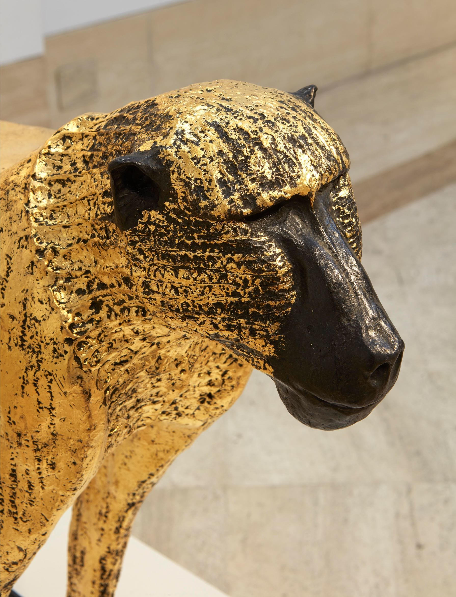 This artwork takes its name from the Ancient Egyptian deity Baba, who was associated with the underworld. The body of the animal, gilded in 24 carat gold, highlights its ancient divine connotations, and its poise and presence evoke regality. The Ancient Egyptians, with their respect of the sacredness of animals and of the animal form, have provided inspiration for Harumi across her artistic practice. Works such as Baba pay homage to the animal spirit that resides in us all; its steady gaze seems to reach beyond the known world into a greater depth beyond, perhaps towards the realm of the divine.