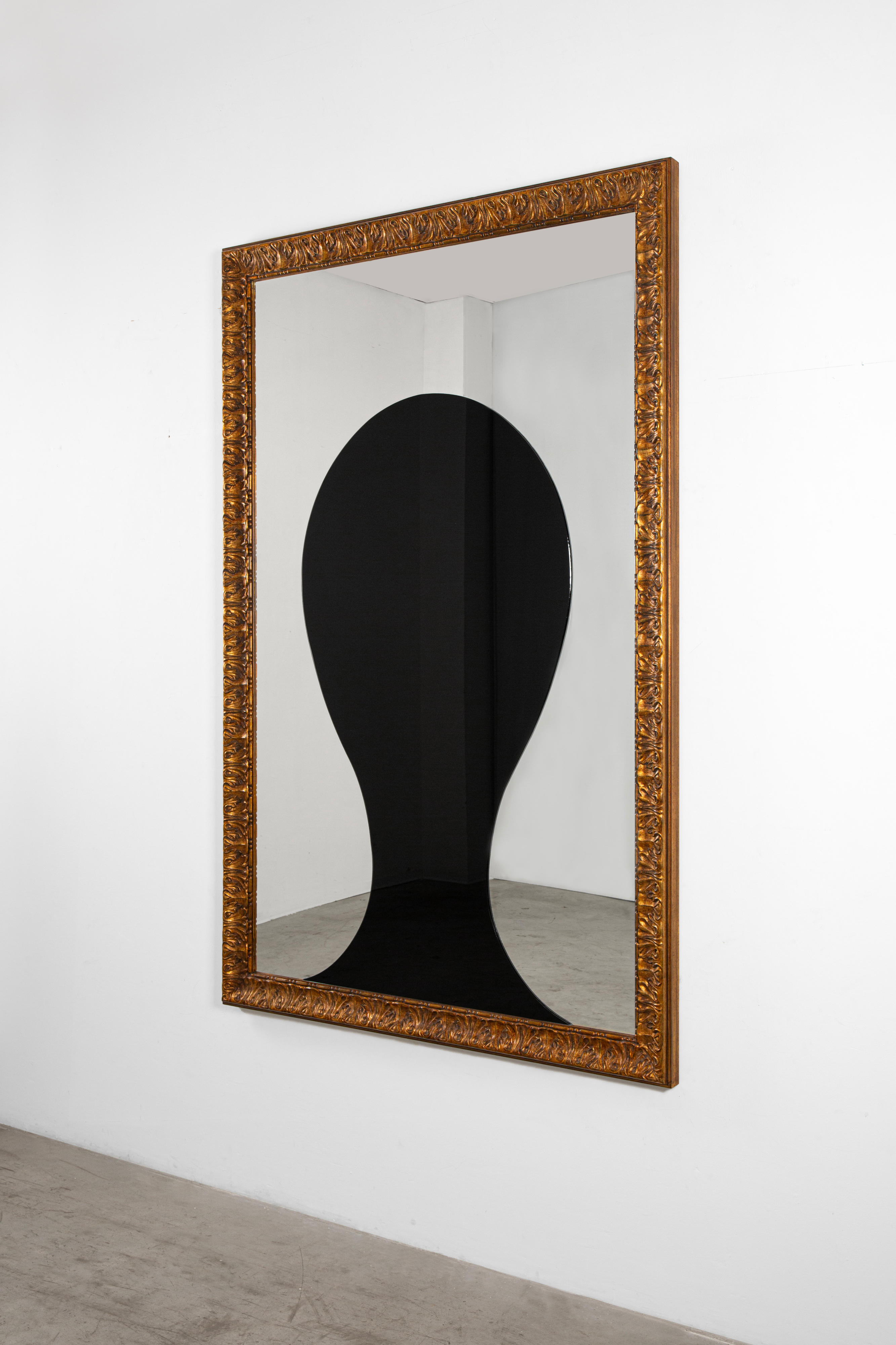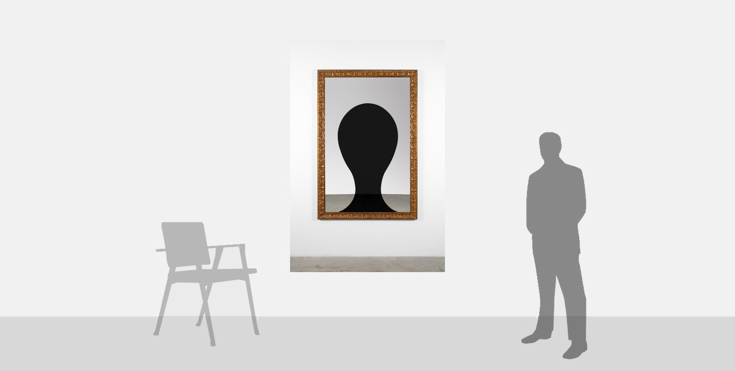 In this artwork Black and Light, a single element measuring over two metres high, composed of two interlocking sections of black and white mirror, is enclosed in a gilded wood frame. The central black form, a silhouette of a simplified head that almost verges on abstraction, offers a compelling meditation on the portrait medium that is underpins much of Pistoletto’s oeuvre. Indeed, this work alludes to the artist’s early oil paintings from 1961, titled The Present – in which the artist painted his likeness directly on a canvas painted black and layered with a thick coat of transparent varnish to create a reflective surface. These paintings were the catalyst for the breakthrough of the Mirror Works made by polished stainless steel. Thus, Black and Light allows for a moment of meditation upon the transformation of the artist’s illustrious career, harking back to the early foundations of his practice, while showing the continued development and innovation that characterises his tireless work of today.
