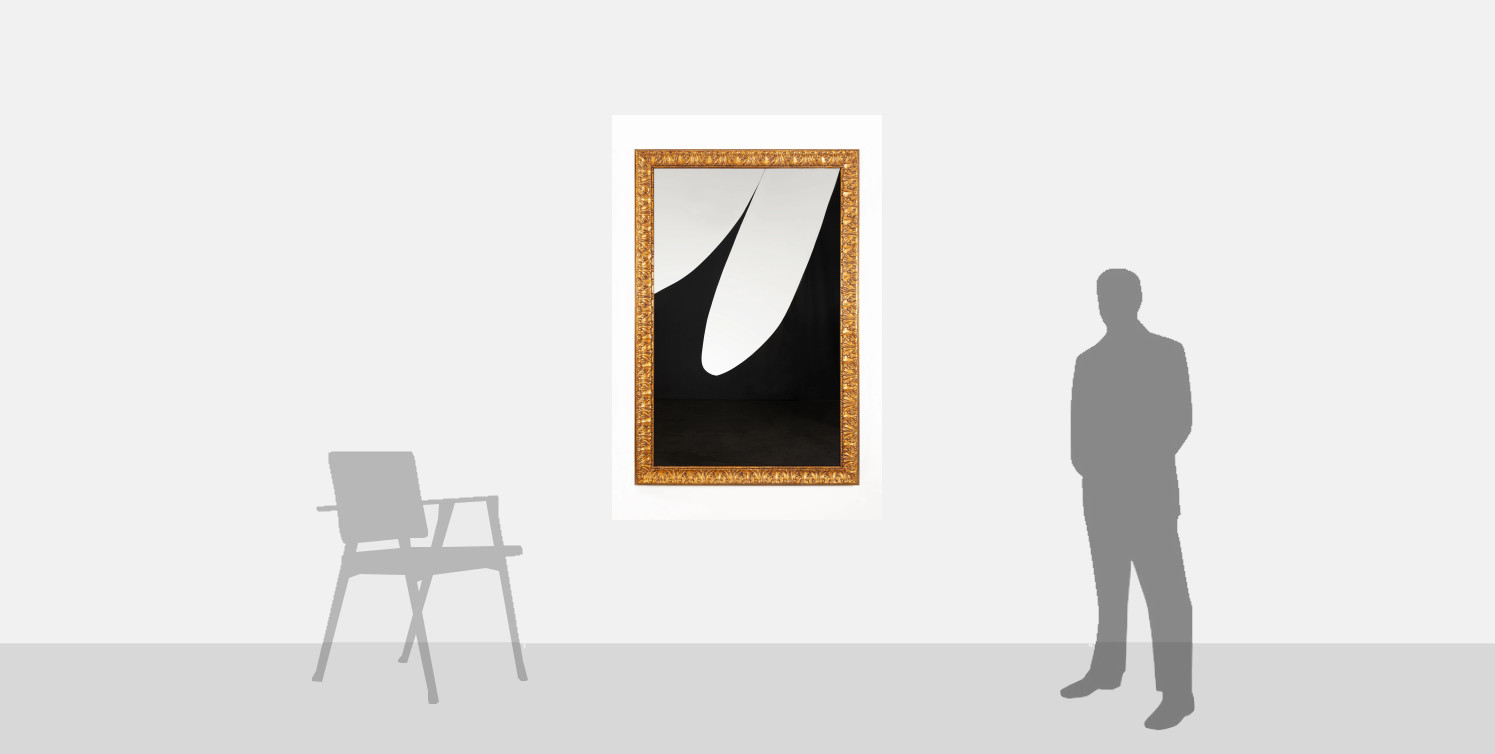 In Black and Light, interlocking sections of black and white mirror are enclosed in a gilded wood frame. The alternation between reflection and partial absorption across the different surfaces explore the balance between light and dark, reflectivity and absorption, subject and object. The hand-cut shapes of the mirror evoke a child's jigsaw, or individuals coming together in a society of peace and cohesion which is a core ambition of the artist's practice. The carefully moulded giltwood frame alludes to how paintings over time have been conventionally presented.