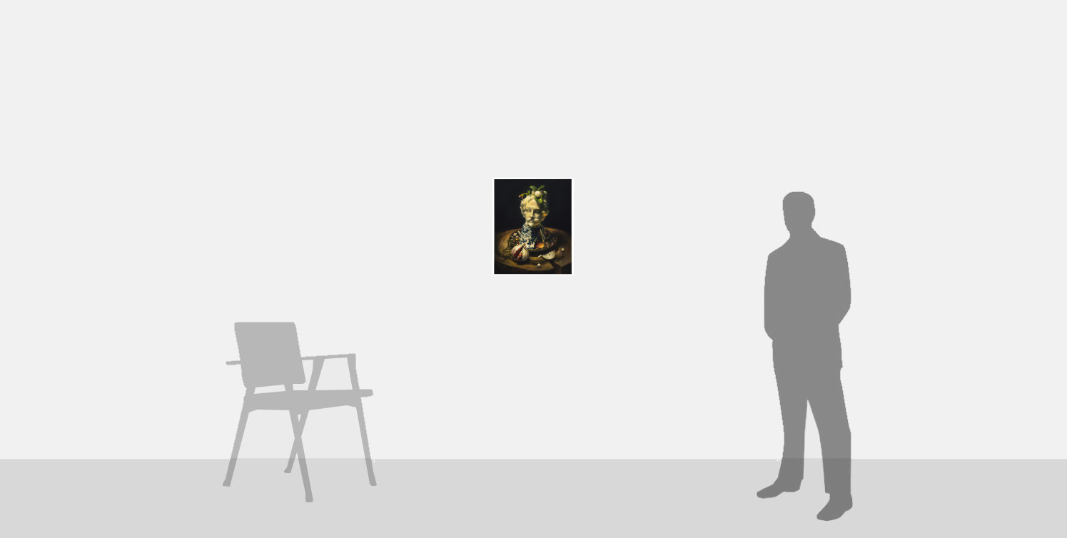 There is something almost supernatural, even occult, about this enigmatic grouping. The head of John Michael Rysbrack’s sculpture of van Dyck, crowned with greenery, is mounted on a broken Royal Crown Derby teacup, transforming it into a pedestal, or perhaps a torso. The cup rests in a differently patterned saucer, alongside vividly coloured cloves of garlic, a spherical bell on a chain and a trio of pearls. This eclectic arrangement of objects rests on a wooden block with a pronounced split, echoing the shape of the break in the porcelain teacup.