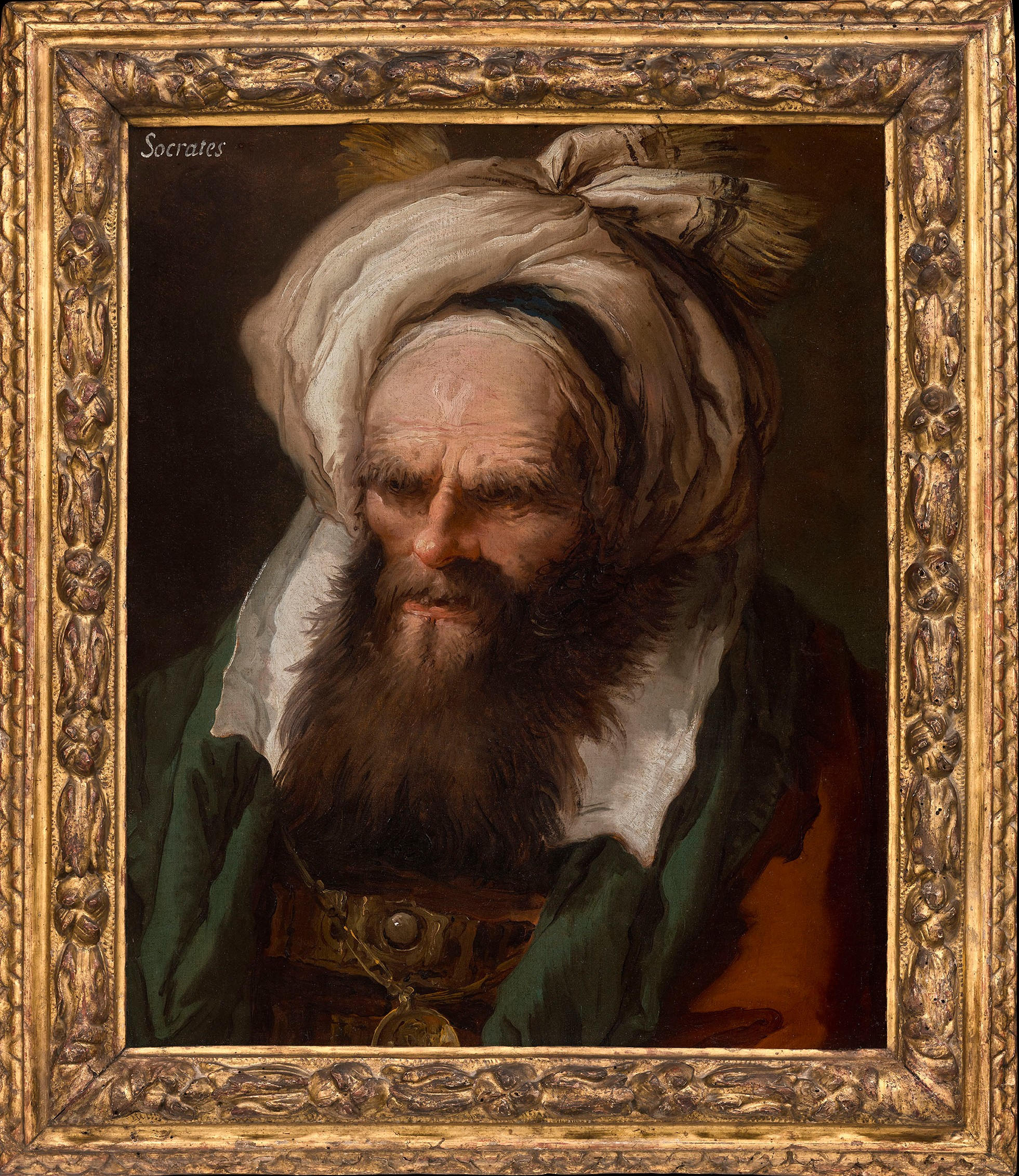 The Socrates in this picture is an impressive yet mysterious figure, his eyes almost lost in shadow below his furrowed brow, and his pursed lips perhaps indicating the intensity of his thought. Costumed in a dazzling green and red robe with a golden clasp, and wearing a striking white turban, his presence is magnificent, yet shrouded in intrigue. With his gaze cast downwards, the philosopher appears somewhat detached from the viewer, adding to his enigmatic persona.
