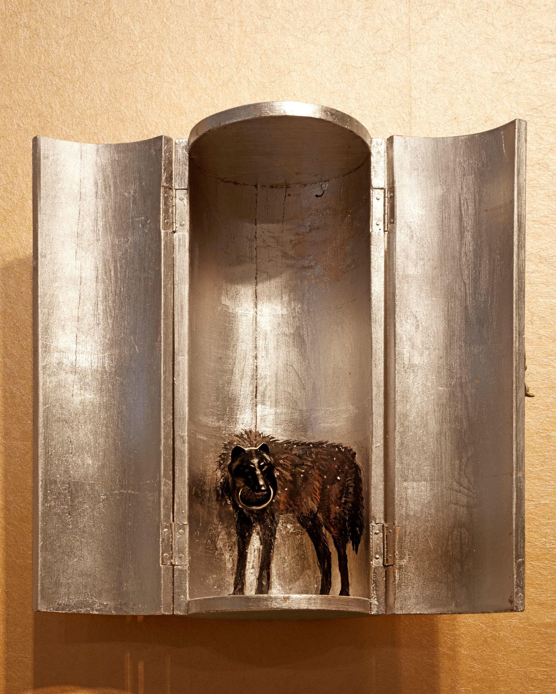 The wolf's eyes, inlaid with 24 carat gold, appear to glow from within, animating the head of this wild creature. Like a talisman with a hidden power, the wolf gazes beyond the known world into a greater depth beyond, perhaps fixed upon an unseen prey, or perhaps looking towards the realm of the divine.