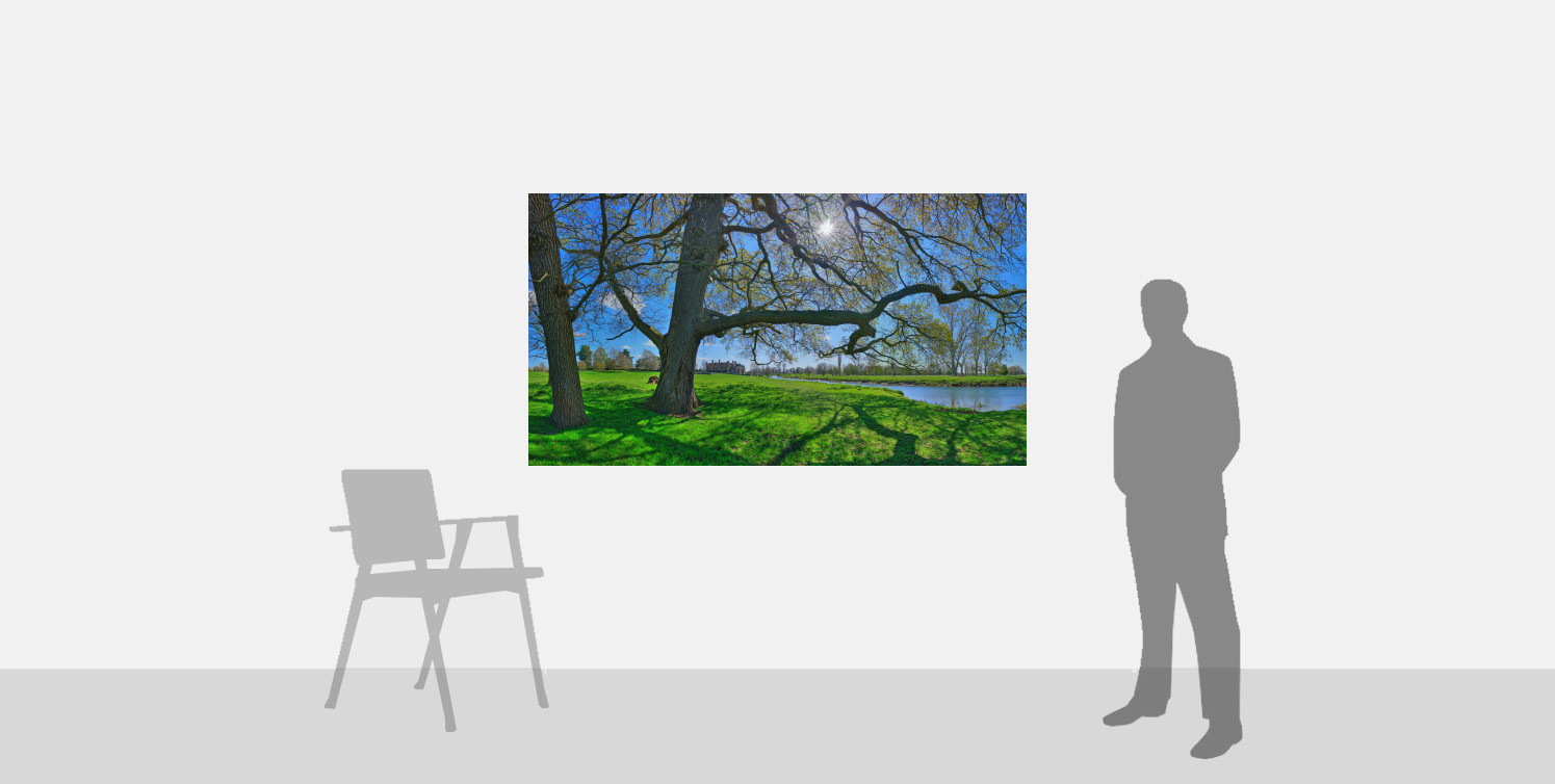 In creating this work and other Dreamscapes, Ambrosi uses computer graphics to combine several photos that he takes of the landscape, awaiting perfect shooting conditions that depend on the light, weather and time. Using the large, multi-layered digital entity that results, the artist then applies bespoke AI technology to achieve the surrealist, dreamlike effect that transforms the photographic depiction into a mesmerising vista. Charlecote is a captivating example of a Dreamscape displayed as a light-box, illuminated from behind by low-energy LEDs. This backlit presentation bestows a luminosity to the work, enhancing the immersive experience with a sense of being physically in this hallucinogenic landscape, of stepping into this alternate reality that prompts reflection upon the infinite complexity of the natural world, and the potential of collaboration between man and machine.