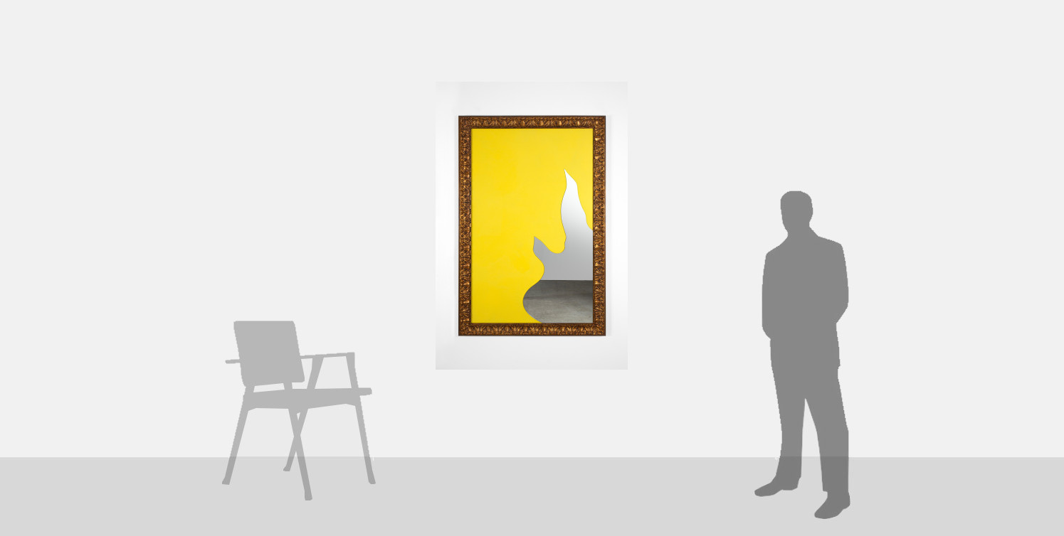 This artwork Color and Light was originally conceived as part of a set of 5, each, formed of hand-cut fragments of mirror, juxtaposed with jute painted in bright colours, and gilded wood frames. The use of the humble material jute, alludes to the artist's early works and typical elements found in the history of art. The present piece is also a standalone artwork in its own right, bold and joyous yellow contrasting with the reflectivity of the mirror. The organic forms imply a level of naivety that evokes the wonder and simplicity of childhood.