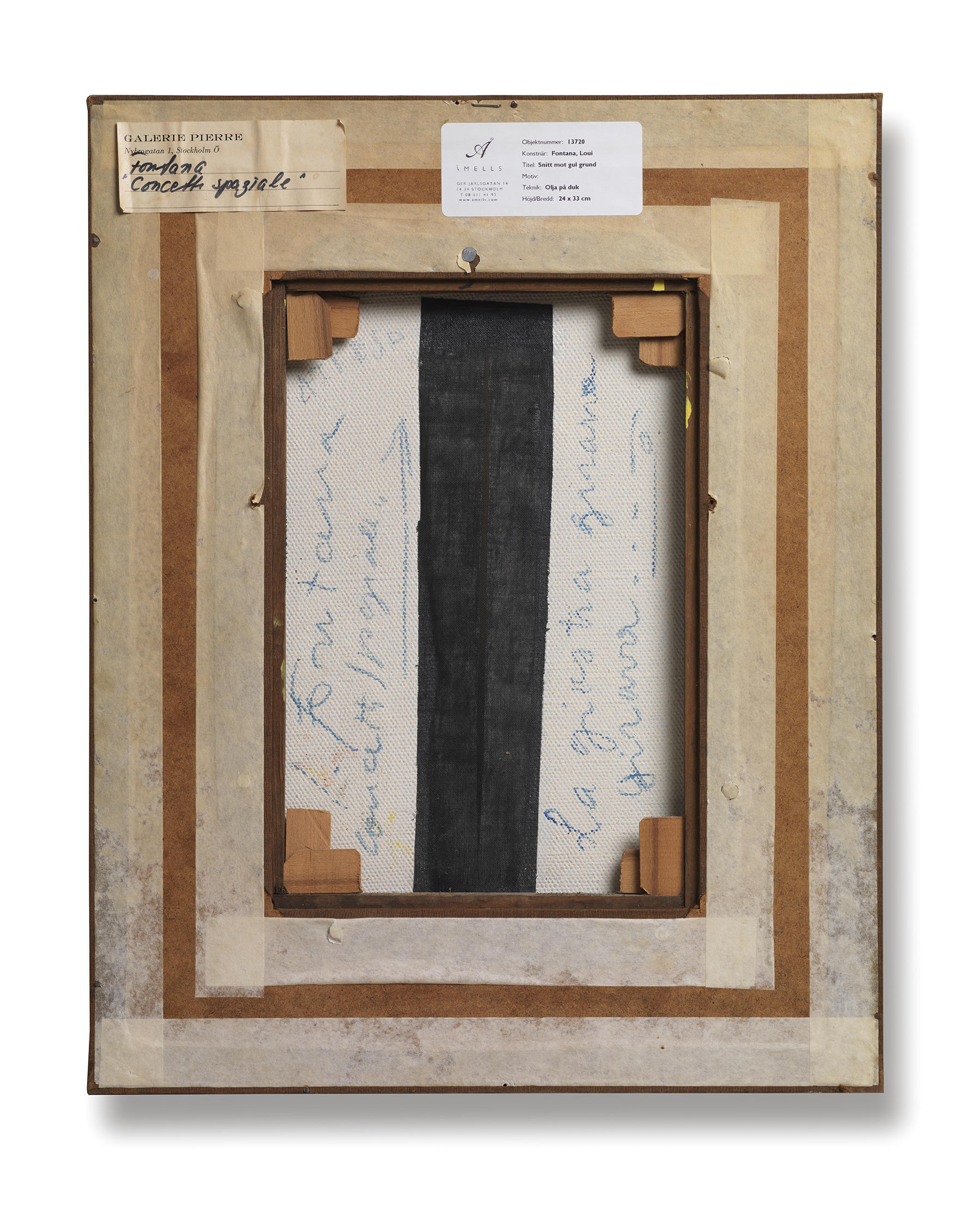A large part of the works presented at the Galerie Pierre were immediately sold and many of them, as is clearly visible from the last edition of the Fontana’s catalogue raisonné, were bought by collectors from Sweden, Norway and Denmark that kept the paintings in their collection for a very long time. Therefore the re-emergence of this work from the very height of Fontana’s career almost fifty years after the Stockholm exhibition, attains a particular importance.