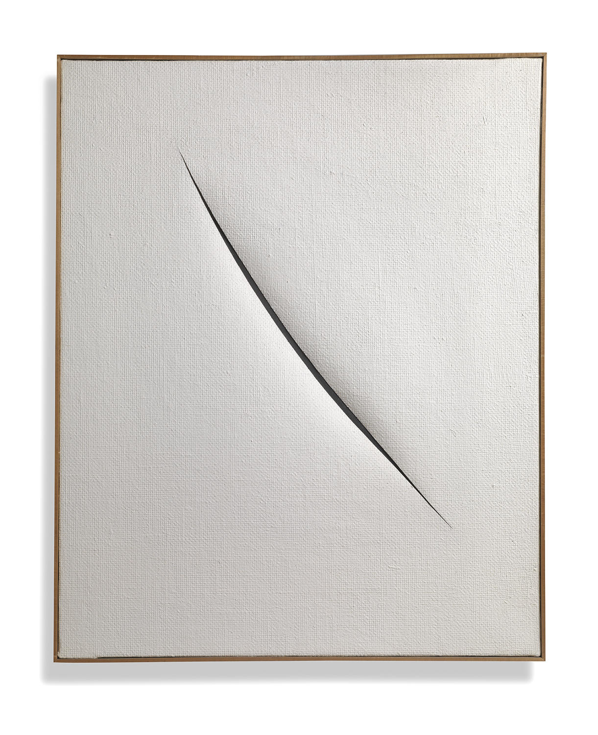 Through the gaping cut into the monochrome, almost pure white canvas of the work, Fontana breaks through the constraints of the canvas, beyond the surface and into the depth of the painting itself. The impression of spatial extension occurs not only in the marginal areas of our work, but also in the opened canvas, through which the viewer's eye explores the mysterious depth of the seemingly infinite space, making it a meditative space, which, as Fontana's added phrase 'attesa' hints at, can be expected.