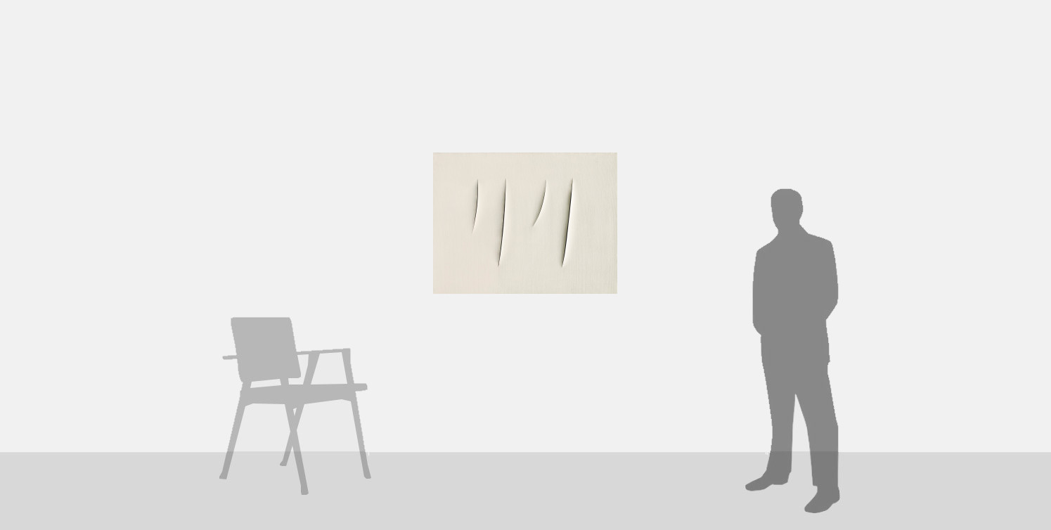 Spanning over a metre in width, Spatial Concept, Waiting (1960) is an exceptional early example of Lucio Fontana’s signature tagli (cuts), which the artist began making in late 1958 and would dominate the triumphant final decade of his practice. Fontana’s tagli were philosophical gestures, creative rather than destructive: in cutting the canvas open, Fontana transcended centuries of art history bound by the two-dimensionality of the picture plane to reveal the infinity of space beyond, an enigmatic fourth dimension in which he saw the limitless future of humankind in the 'spatial era.' Having first pierced the canvas with buchi (holes) in 1954, Fontana spent some years experimenting with surface ornamentation, painting with thick impastos and often embedding glass fragments and glitter into his canvases, before arriving at the serene austerity of the monochrome tagli, truly the apex of his audacious, ever evolving formal vocabulary. With its hypnotically pure white surface sliced with a quartet of vertical incisions, the present work is among the earliest examples of this ground-breaking series. Creating a rhythmic cascade of gliding movement, the gently angled cuts of Spatial Concept, Waiting send ripples of energy through and beyond the work’s surface, transforming it from a static, inert pictorial surface into a dynamic object that interacts and encompasses the space surrounding it—it is neither painting nor sculpture, but a 'Spatial Concept'. The cuts alternate in a paired dance between longer and shorter lengths, brought to life by their supple, curving motion and rhythmic arrangement. This at once balletic and calligraphic arrangement exemplifies the elegance with which Fontana gave visual realisation to his conceptual innovation.