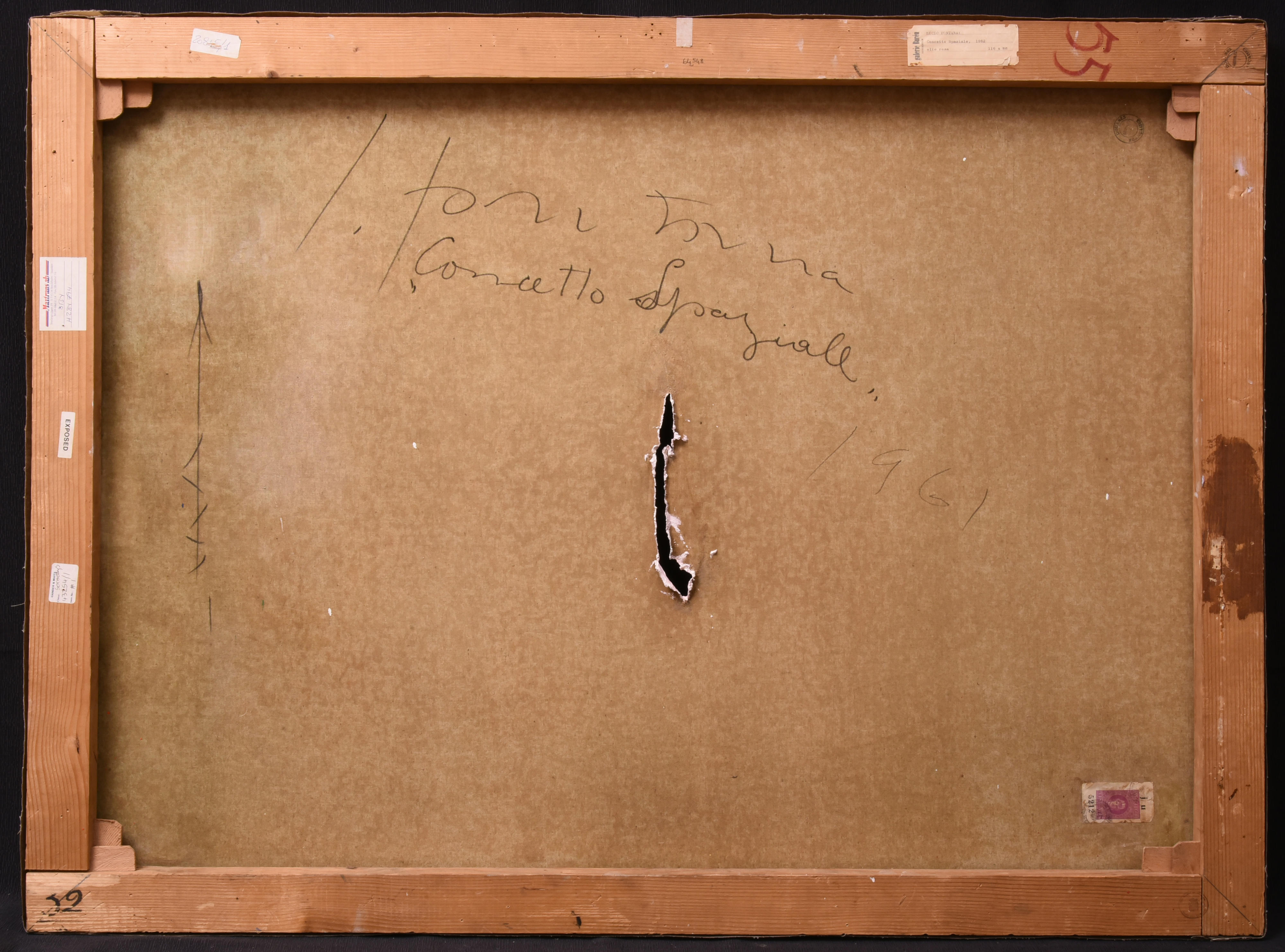Central to Fontana’s artistic practice was the search for a new visual language that expressed both the exhilaration and the existential anxiety of the modern age. "The man of today,” Fontana once noted, “is too lost in a dimension that is immense for him, it is too oppressed by the triumphs of science, is too dismayed by the inventions that follow one after the other, to recognise himself in figurative painting. What is wanted is an absolutely new language” (quoted in A. White, Lucio Fontana: Between Utopia and Kitsch, Cambridge, Mass. and London, 2011, p. 260). By 1962, when the present work was executed, mankind has achieved previously unimaginable advances in science and technology, sending first satellites and then cosmonauts into space. Man’s extraordinary rupture of the fabric of the universe seems echoed in Fontana’s buco, while the trembling lines quivering around this central void reflect the disruptive orbit of man in space as well as the uncertain trajectory of humanity in this great unknown. Indeed, as Fontana once noted of the striking colours in which he rendered his Olii, "The colour of the grounds of these canvases is a bit loud, [indicating] the restlessness of contemporary Man. The subtle tracing, on the other hand, is the walk of Man in space, his dismay and fear of getting lost; the slash, finally, is a sudden cry of pain, the final gesture of anxiety that has already become unbearable” (quoted in P. Gottschaller, Lucio Fontana: The Artist’s Materials, Los Angeles, 2012, p, 90).