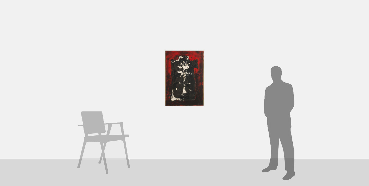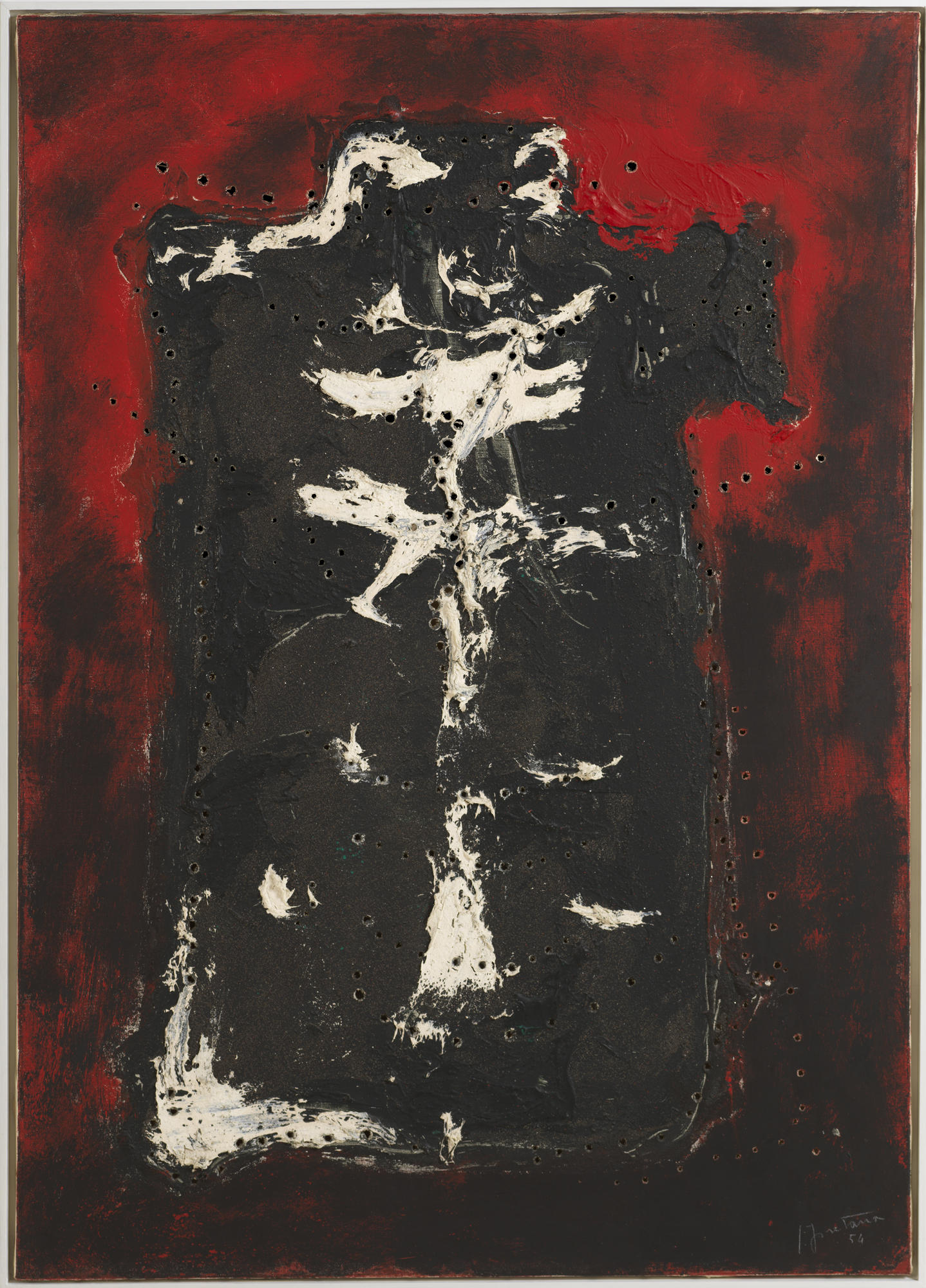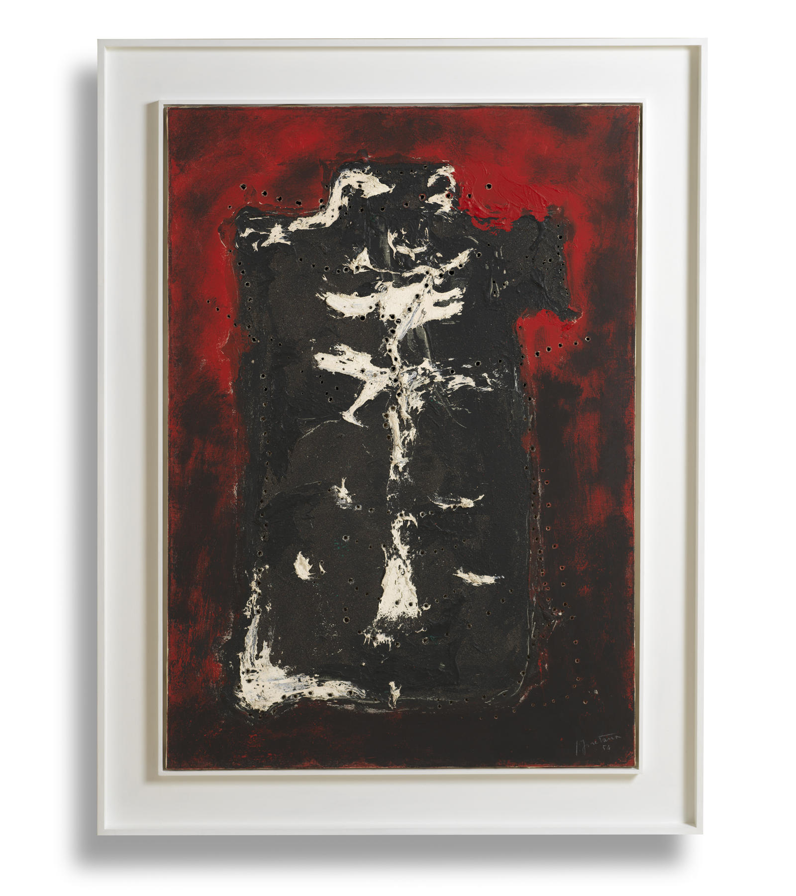 The present work represents one of Fontana’s early barocchi (baroque), a cycle of artworks initiated in 1954, introducing the artist’s most unapologetically emotive and gestural work. With visual aesthetics characterised by pictorial building blocks of holes, paint and glass fragments, barocchi artworks are defined by Fontana’s use of heavily impastoed paint for the depiction of signs. Placed against monochromatic backgrounds, he used fine and coarse sand in the impastoed areas, applying the mixture with a spatula. In addition, the signs sometimes vaguely allude to figures and the various pictorial elements are characterised by the dynamic ‘baroque’ accent that gives the cycle its name. The strong presence of an Informel vocabulary in these works reflects Fontana’s interest in the immediacy of the sign as expressed through the materiality of paint. With the Informel artists’ belief that that they could literally trace and inscribe the inner mental impulses through physical movement into thickly textured paint, Fontana’s barocchi embody the visual representation of such a concept. Concerning their artistic production, in samples taken from highly impastoed areas of two barocchi from 1956 the presence of PVA was confirmed. The PVA that is usually present in Fontana’s works tend to come from the use of house paints or Vinavil, an Italian adhesive, used as means of increased viscosity or as a binder.