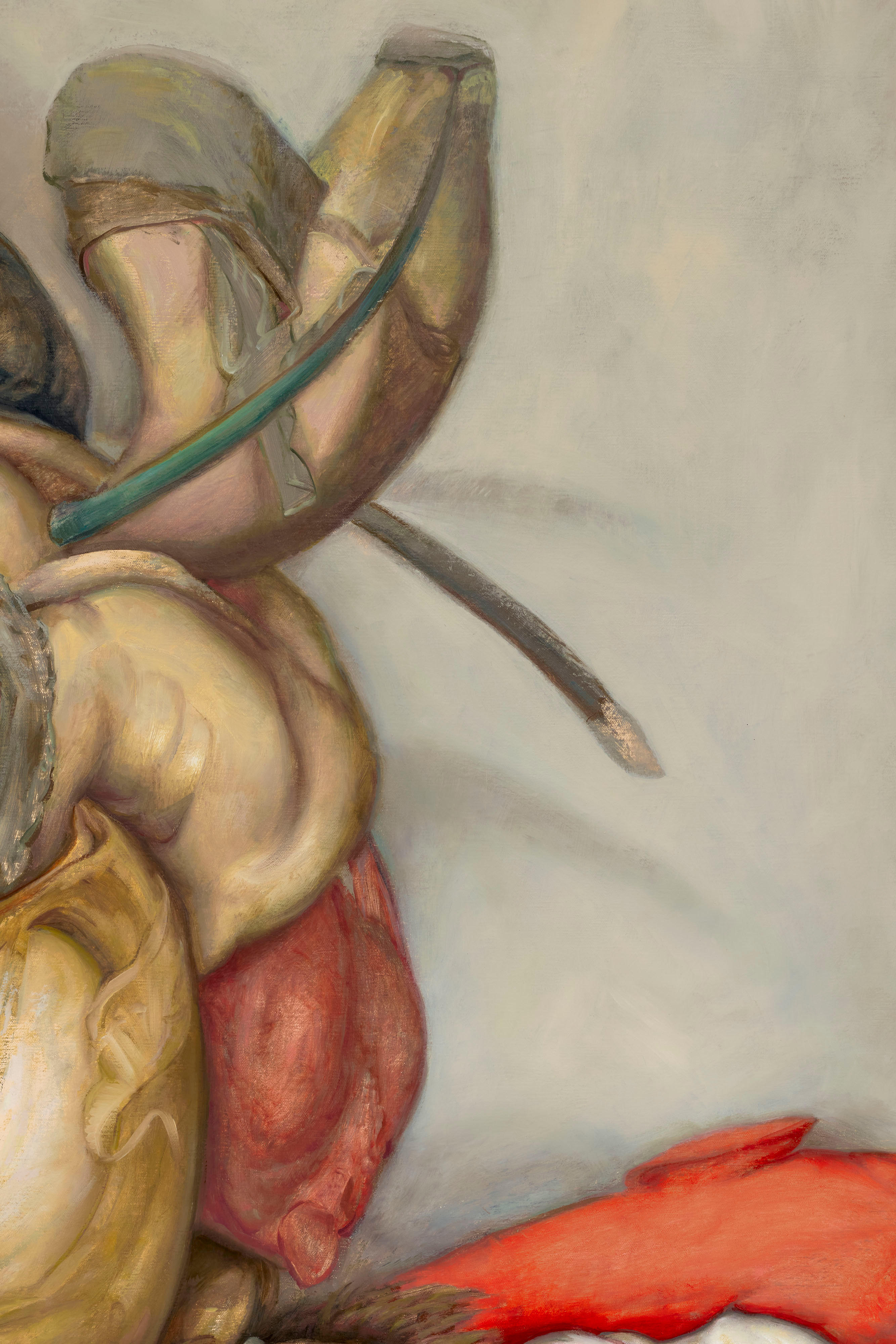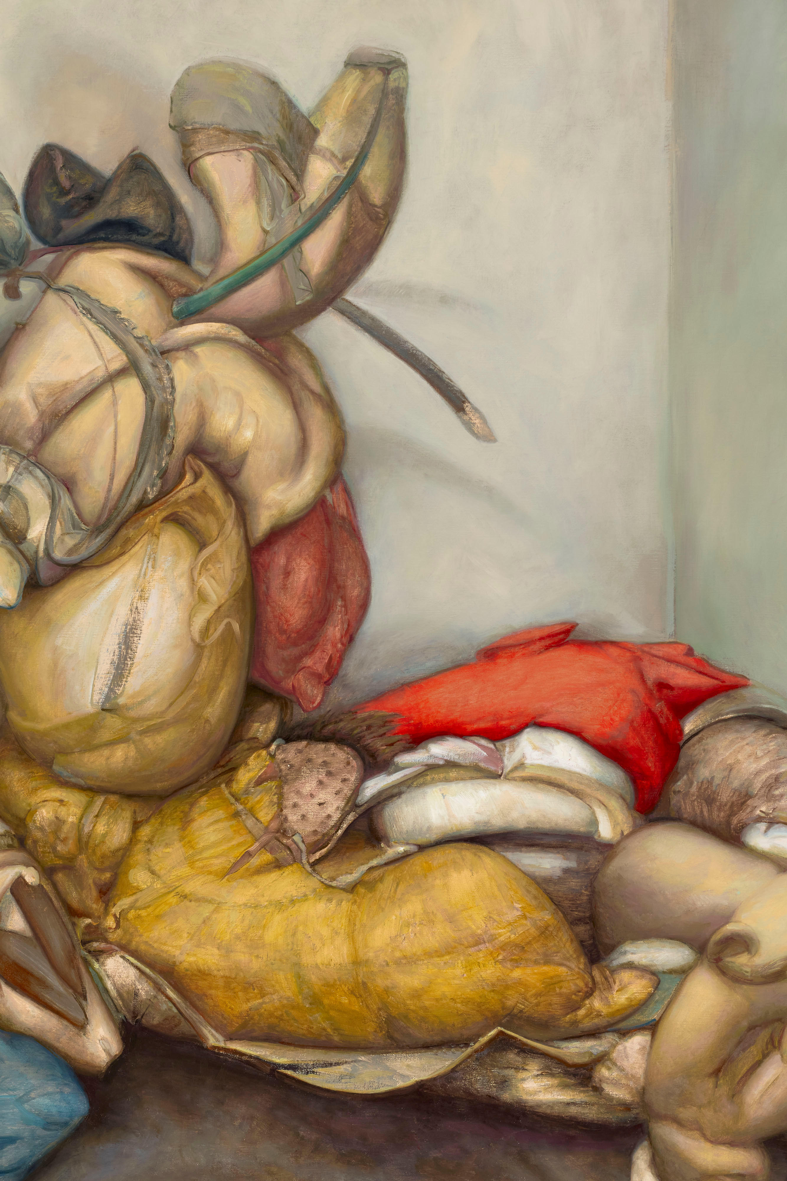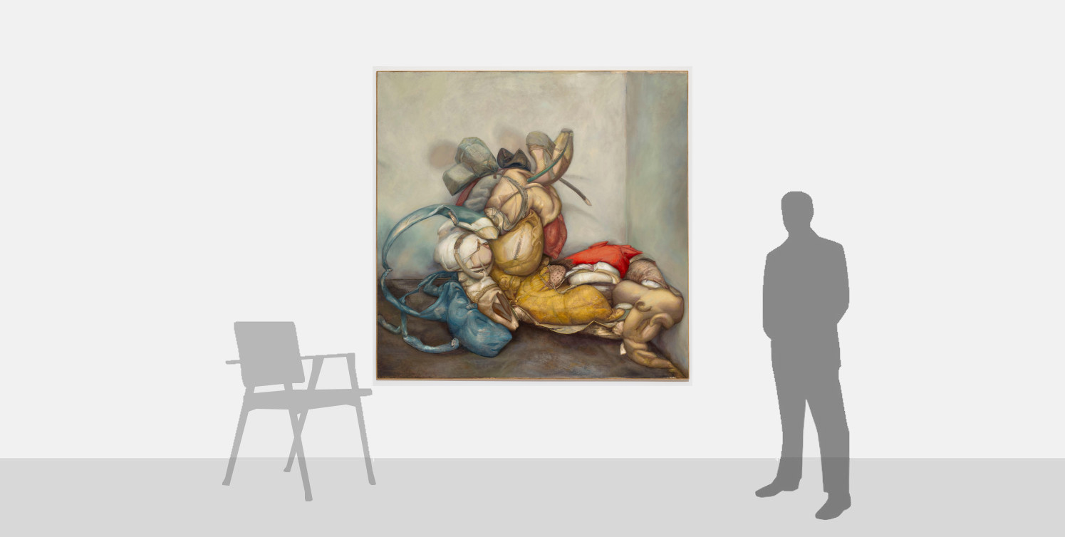 Santos’ inspirations are drawn from the more awkward or subversive corners of art history, such as Old Masters who were the eccentrics of their era, such as Giuseppe Arcimboldo, or those whose style was at odds with conventional beauty, such as El Greco or Francisco Goya. Further, his paintings take influence from the fleshy forms of Peter Paul Rubens and the expressive grandeur of Michelangelo and Raphael.