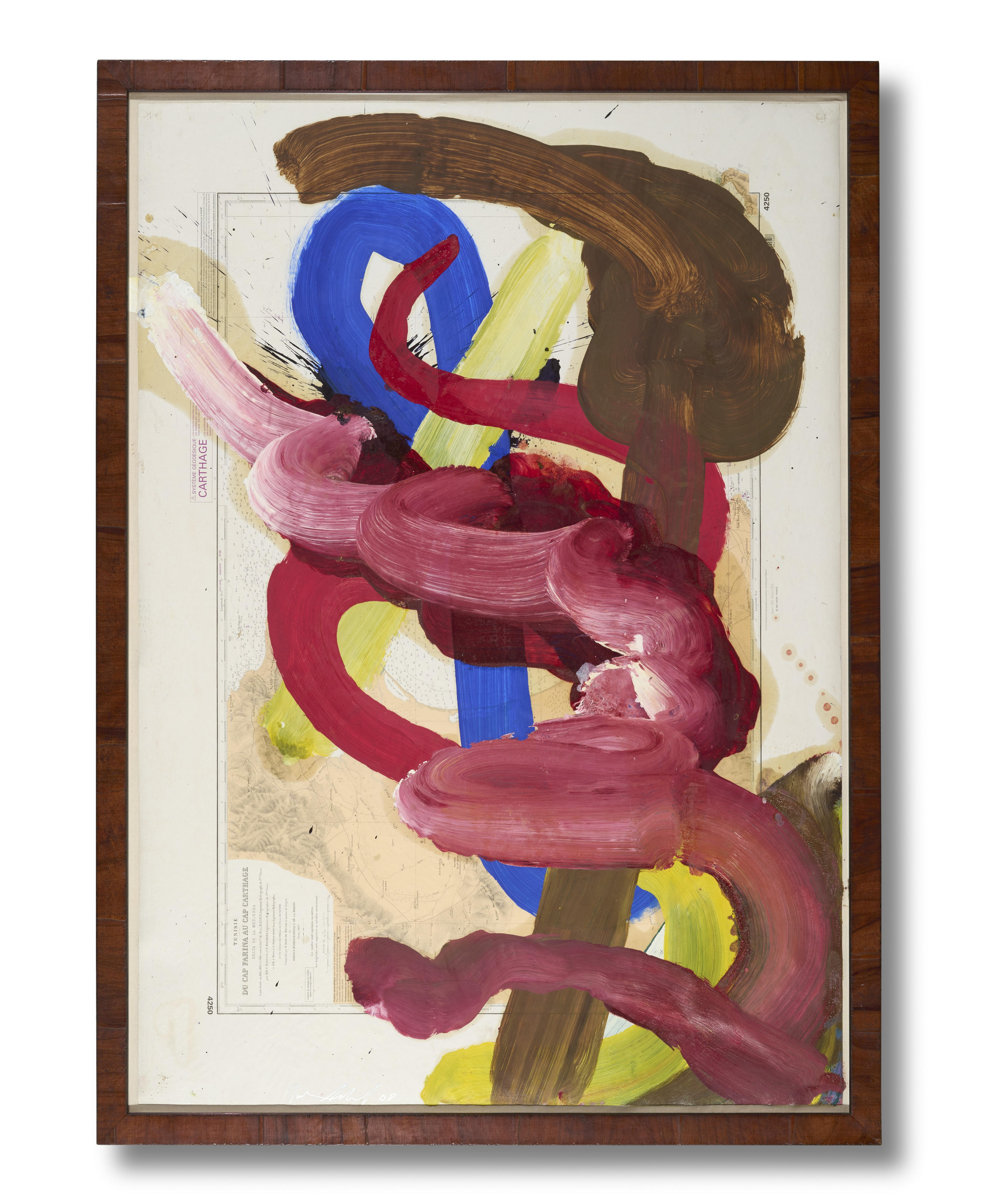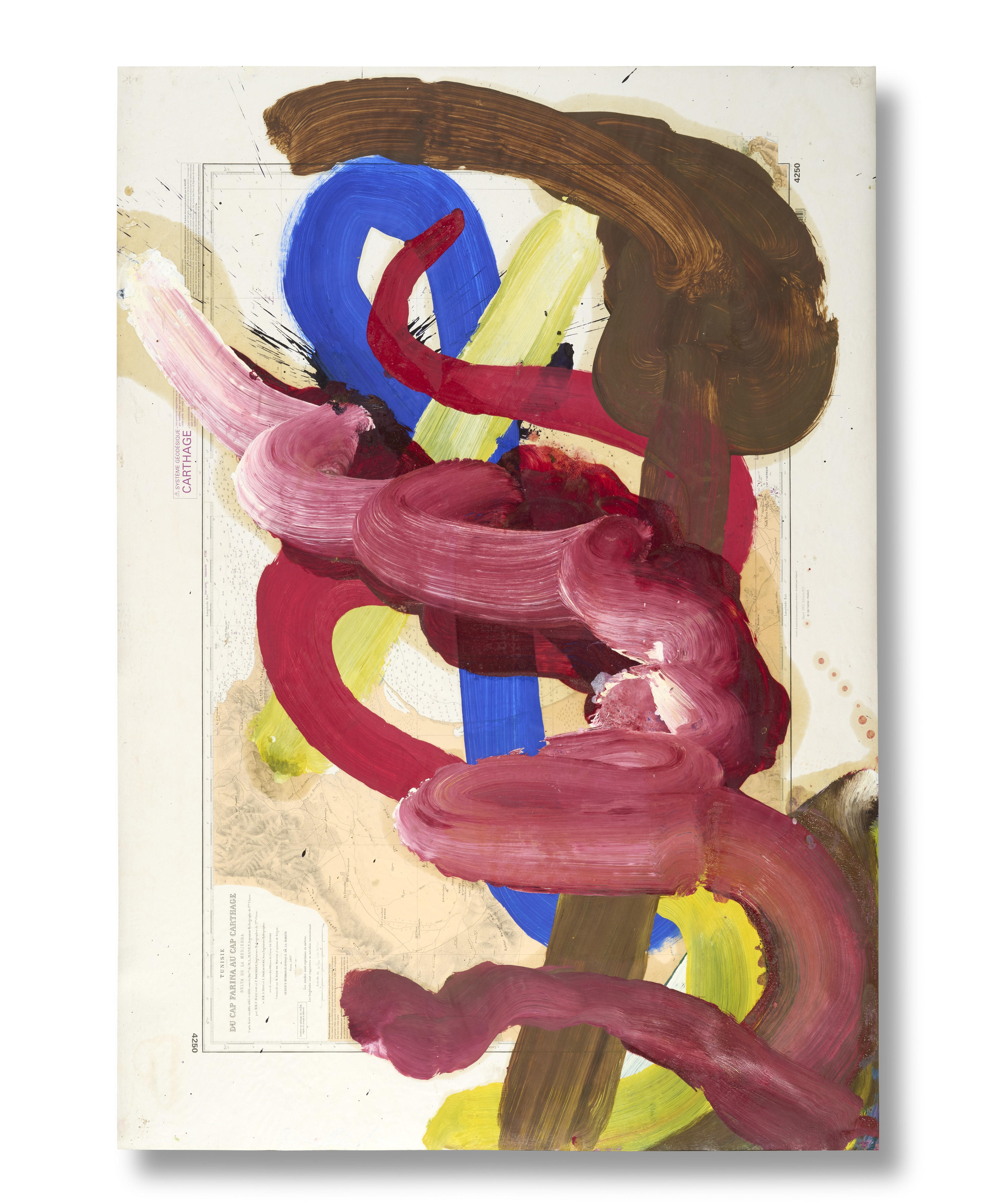 “Schnabel’s work is rooted in exploring and trying to define the difference between epiphany and the commonplace. In his recent series of drawings on nautical maps this tension is articulated in direct terms. Often a single gesture or cluster of painterly forms depicts the painter’s presence, a compressed or distilled essence…Through his treatment each map becomes a backdrop for events – pictorial events that he acts out, inviting narrative.”—David Moos, “Sounding in Fathoms: Julian Schnabel’s Recent Navigation Drawings” in Julian Schnabel: Navigation Drawings, 2008