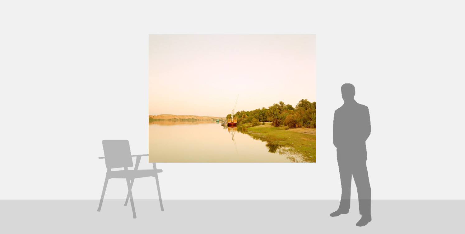 Each photograph reflects Esser’s interest in 19th-century landscape painting, historic postcards and the literary works of Gustave Flaubert, Marcel Proust and Guy de Maupassant. El-Kab II embodies these influences as well as the reality of the present. Two boats are moored at the centre of the composition, a further jetty visible behind. The river bank connects the viewer with the distant landscape, the dramatic perspective of the work giving a sense of infinity. The expansive areas of river and sky appear like endless voids; the reflections of the hills, vegetation and mast of the boat are the only disturbances on the otherwise still water.