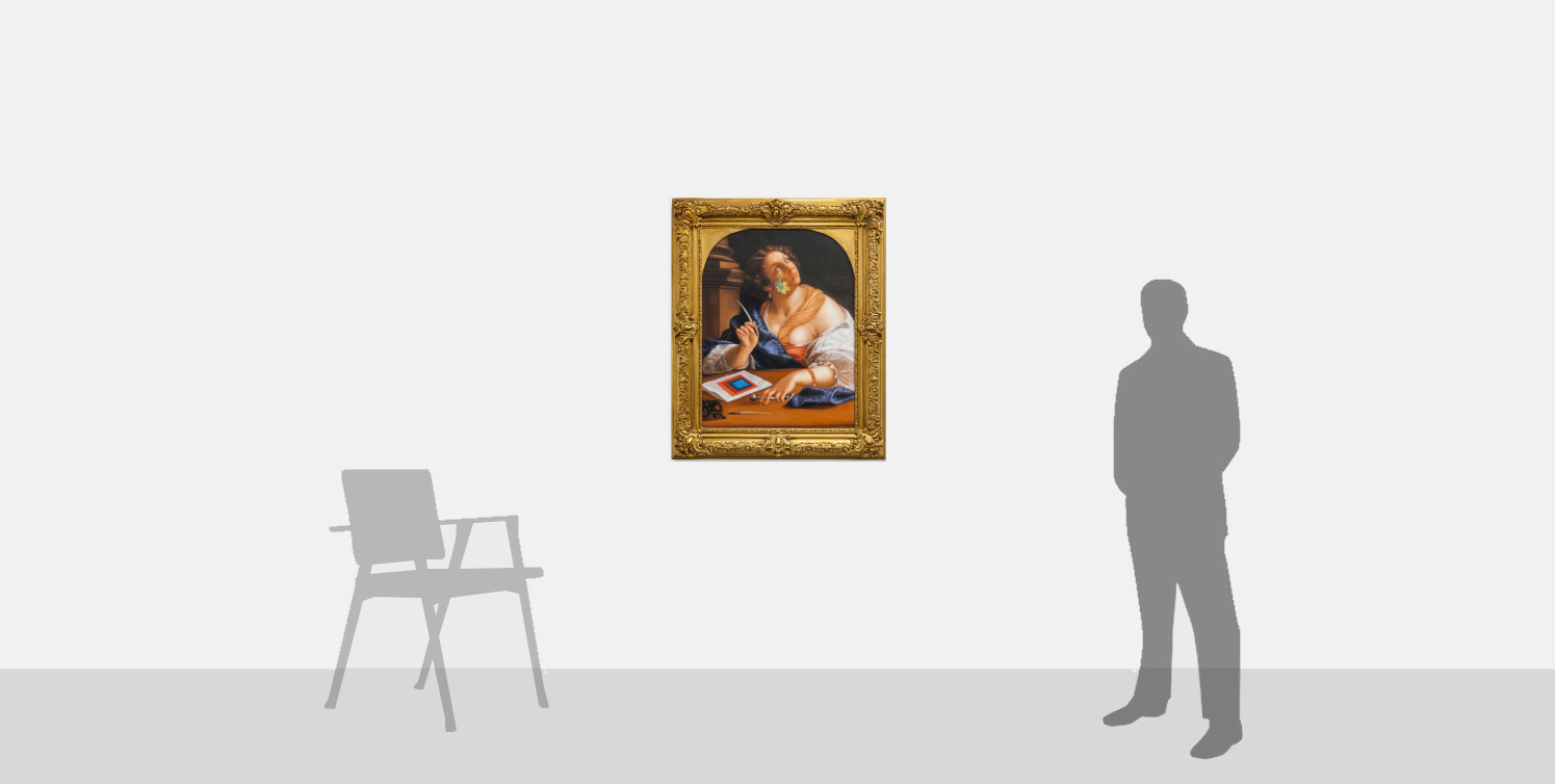In the present work Francesco Vezzoli uses as his subject matter, a painting attributed to Artemisia Gentileschi that Vezzoli probably saw at the great exhibition held in Milan and Paris in 2012 (Artemisia Gentileschi-Storia di una passione). Artemisia’s painting becomes for Vezzoli a vehicle on which he builds and demonstrates his talent in manipulating famous images and for unifying totemic elements of his disparate artistic interests: in this case a flower, inspired by the work of Natalia Goncharova, is applied on the figure’s face and on the sheet of paper on the table, a Josef Albers painting is reproduced. The pairing of the Goncharova flower with the Gentileschi work is perhaps alluding to the radical nature of both artists who due to their gender, were obliged to fight against prevailing attitudes to establish themselves artistically, and the Albers may also allude to the “Allegory of Rhetoric” since his works are poetic essays in colour combination and invariably have detailed inscriptions on the verso explaining their rationale and construction.