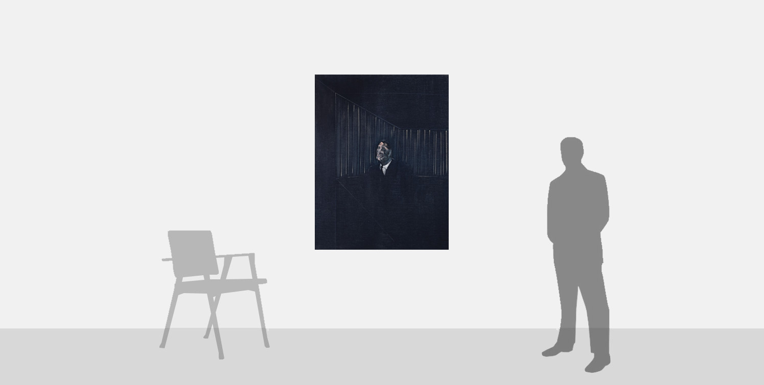 In the Man in Blue paintings, the glass cube in the Popes series becomes an architectural framework of carefully aligned vertical lines, which could allude to a hotel bar. The outline and configuration of the enclosed spaces are identical in each of the seven paintings, in which the central figure seems to be trapped, contained behind a counter and enclosed within bars that prevent his escape. Just as the eight popes oscillate between arrogance, malevolence, and anguish, the mood of the blue-suited man changes throughout this series, moving from confidence, calm, indifference, and dreaminess to desperation and despair, also echoing the Three Studies for the Human Head (1953), the first triptych ever produced by Bacon.