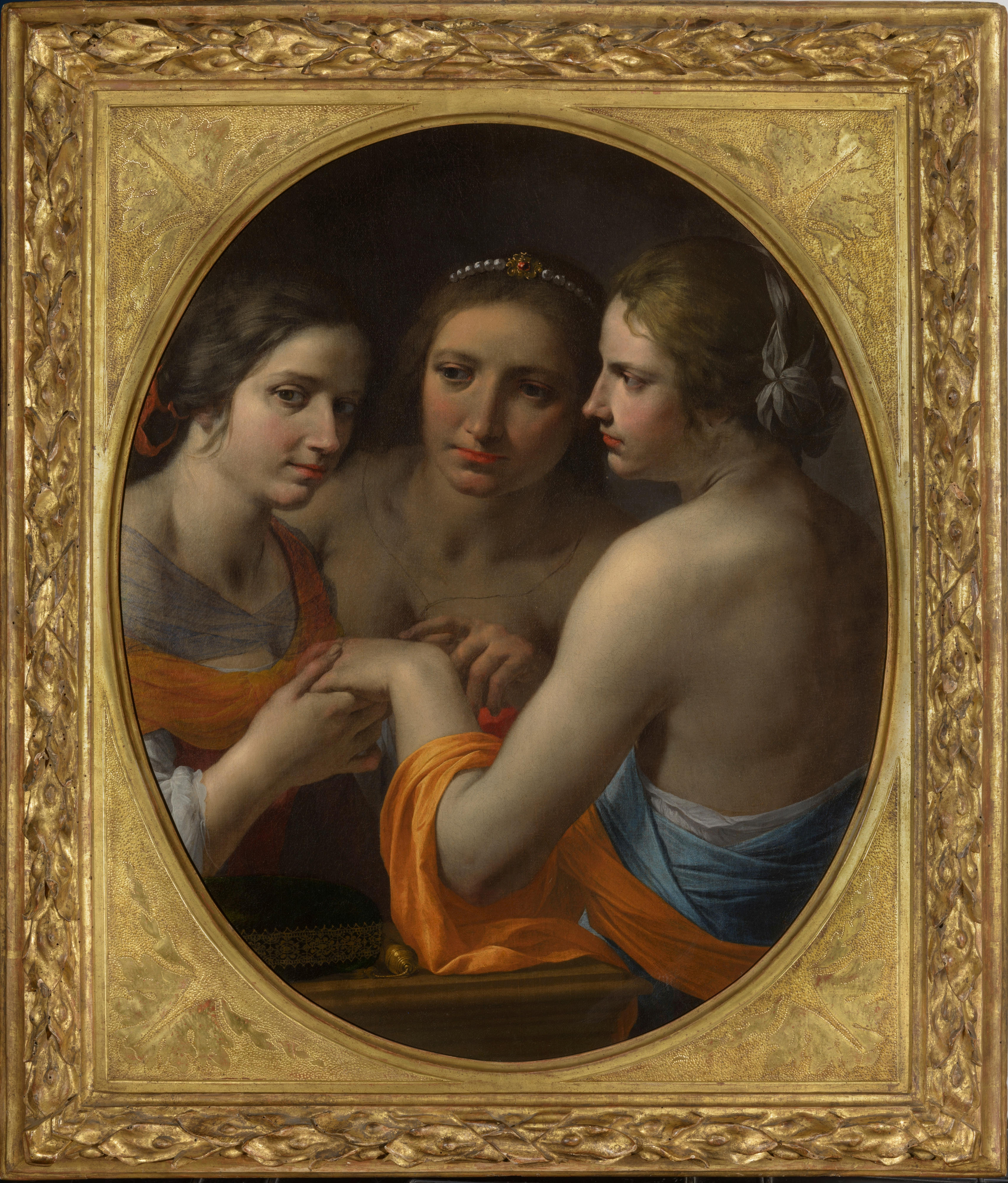 Three young women, shown half-length and draped in diaphanous veils, one seen from behind, the other frontally and the third from a three-quarter angle, are harmoniously presented within an oval-format canvas. The image of the Three Graces derives from classical mythology and was widely diffused in the visual arts of the cinquecento and the seicento. The Graces were the beautiful daughters of Venus and Bacchus, the gods who responsible for providing human beings with pleasure.