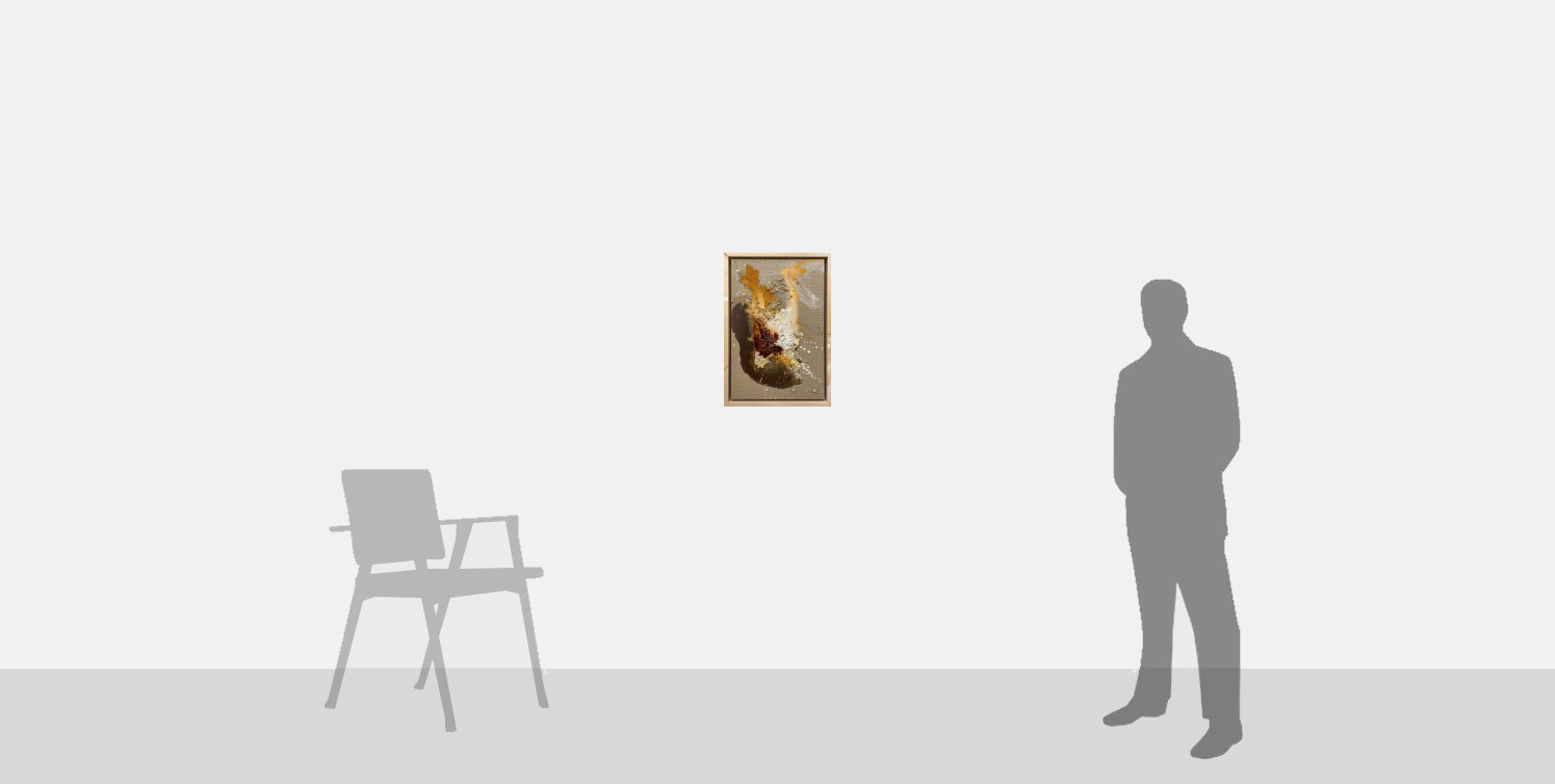 This dynamic painting is a response to Plan Segnas Sura, a magnificent high valley in the Swiss Alps. The Plan is a post-glacial floodplain, with hundreds of small streams and channels of water that meander and change route across the plateau. These streams facilitate the constant shifting appearance of the area, distributing and redistributing rocks, sand, and other sediment. Anna’s painting, exhibiting earthy and golden hues that evoke the richness of the soil, also incorporates organic material such as small fragments of rock that create a textural experience reflecting the terrain of the Plan Segnas Sura. The materials seem to surge outward from the centre of the canvas, a testament to the endless transformation and flow of the landscape of the mountain plateau.