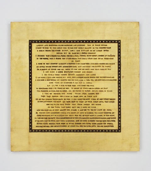 As well as sculptures, Sachs has achieved renown for his paintings, such as this present work. King Heroin demonstrates another technique, alongside traditional painting methods, which Sachs incorporates in his works: 'pyrography', or wood-burning. Here, the artist has precisely and intricately burnt the wood panel with words, to transcribe the lyrics of the song King Heroin by American musician James Brown, released in 1972. Brown is a figure referred to in many of Sachs's works, and the lyrics of King Heroin emphasise the dangers of a heroin epidemic sweeping the US, undermining the idea of the 'American dream' and instead laying bare the social ills and disappointment of many in America at the time. By using the violence of fire to etch these words into a panel laid with lustrous gold leaf, Sachs heightens the irony and conflict between expectation and reality, intimating that capitalist and consumer society might not be as desirable and faultless as it is made to seem.