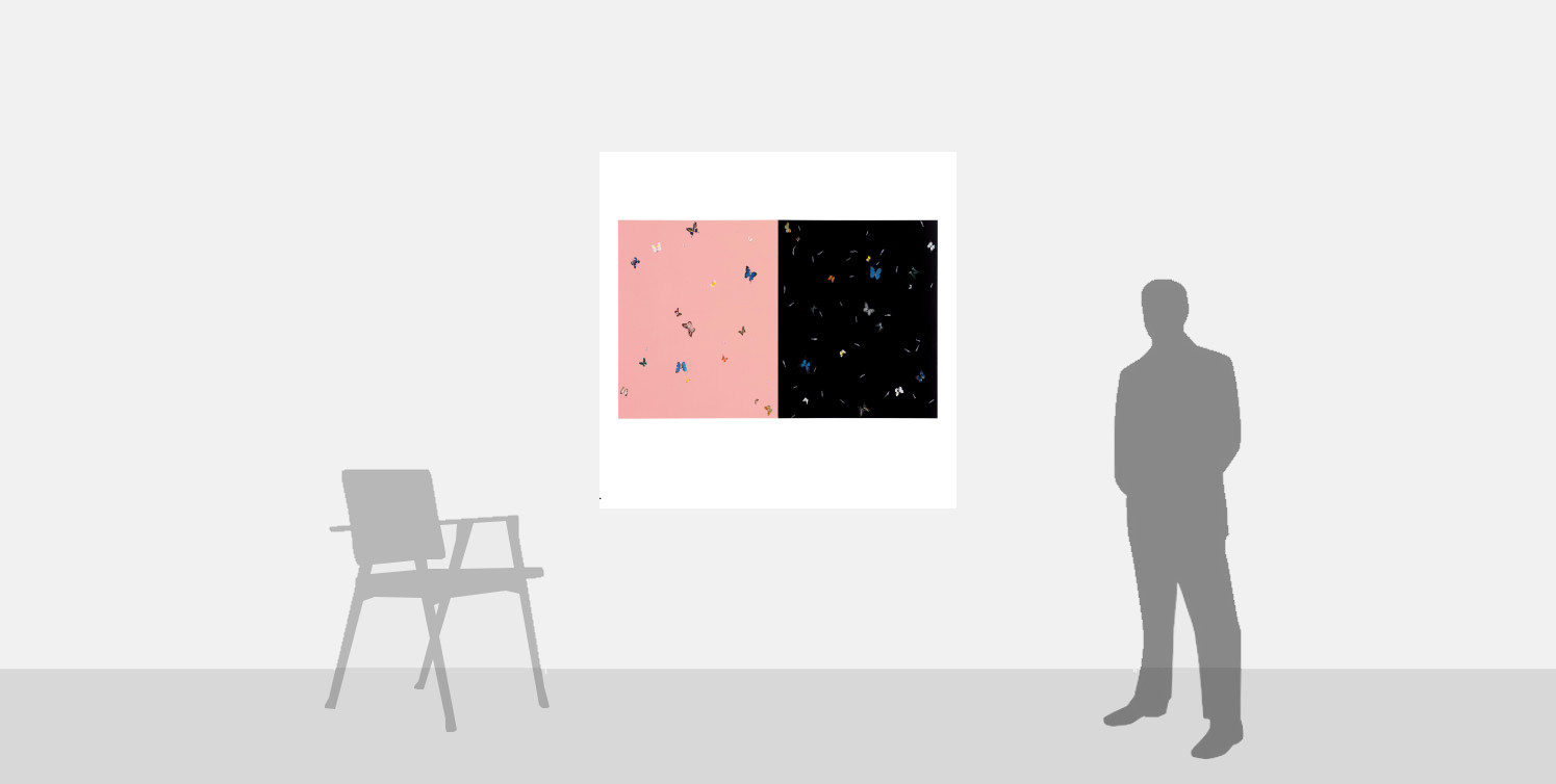 The monochrome paintings, with apparently random placement of the insects, are the earliest example of his use of these creatures, which were to become one of his most recognisable motifs. He subsequently expanded the use of this insects in multicoloured pieces, or in works where the butterflies are arranged in specific patterns. This work is particularly striking as the butterflies are not the only object encrusted into the paint; on the pink canvas, there are laboratory-grown diamonds, and on the black canvas, there are scalpel blades. These objects allude to love and desire, on the one hand, and violence and death, on the other. Such contrasting themes are common in Hirst’s works, using commonly recognised items to evoke conflicting sensations – here, the conflict, but also the similarities, between passions of love and hate are explored in a subversive, audacious manner.