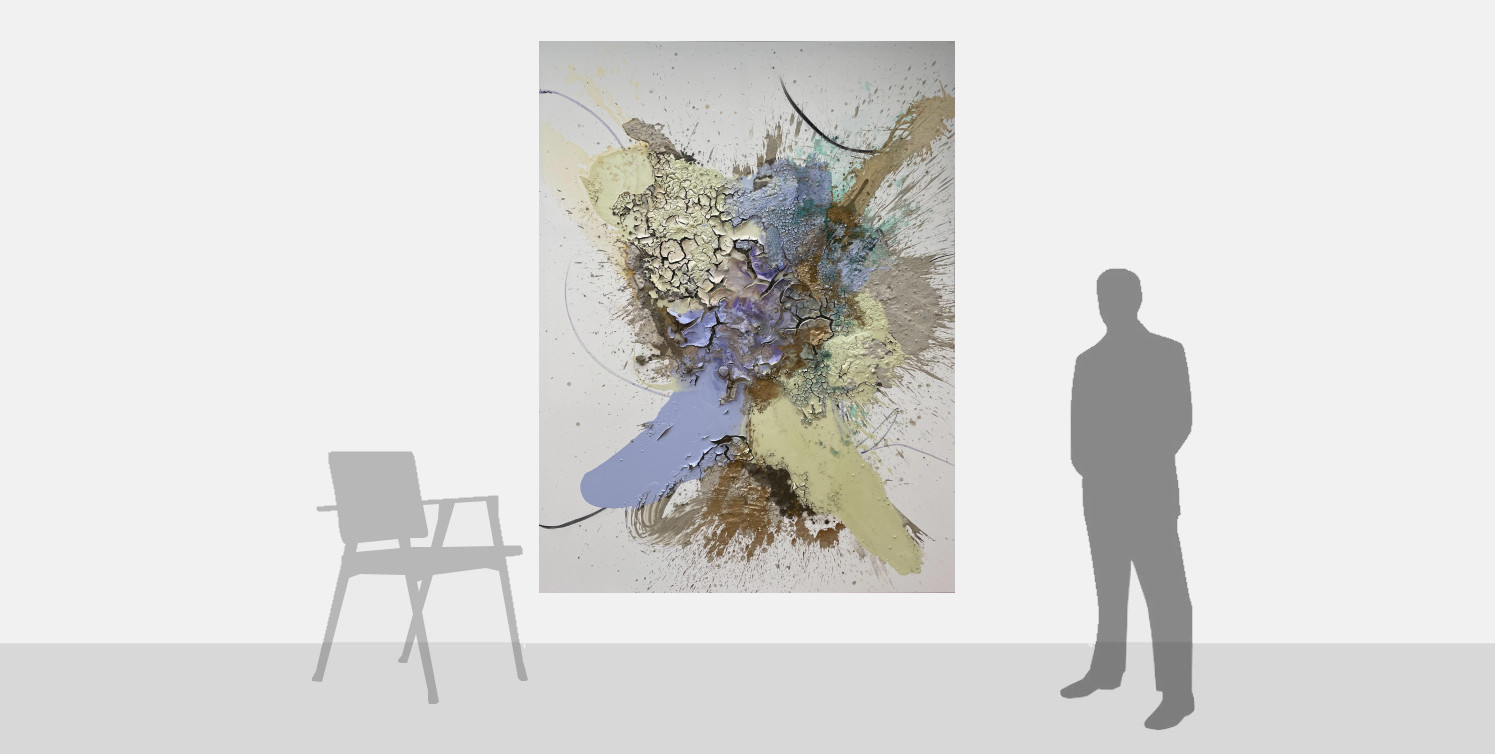 In her paintings, Anna does not seek to create accurate representations of a landscape; instead she aims to translate her personal experience of a place, fusing visual stimuli with emotional memory. The artistic process is a continued journey of discovery, and it is often only during the actual making of the artwork that certain elements of her own perceptions are revealed to her. The thick, textured surface of Lullaby gives physical form to the painting, connecting it with the earth that was its inspiration. The complementary hues of pale lavender-grey and the yellows and ochres allude to the beauty and wonder of the natural world, the soothing tones of a landscape lullaby. Painting, for Anna, is an instinctive and reactive process, and she constantly adapts according to the behaviour of the materials on the canvas, entering into a symbiotic relationship, which allows her to convey her experiences through a unique, personal artistic language.
