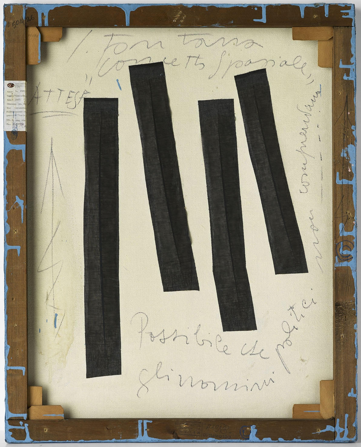 The slashes are the culmination of Fontana’s investigation of time and space, an investigation that as Erika Billeter (in Lucio Fontana 1899 – 1968: A retrospective, catalogue of the exhibition, New York 1977, p. 13) pointed out “challenges the history of painting. With one bold stroke he pierces the canvas and tears it to shreds. Through this action he declares before the entire world that the canvas is no longer a pictorial vehicle and asserts that easel painting, a constant in art heretofore, is called into question. Implied in this gesture is both the transformation of a five – hundred year evolution in Western painting and a new beginning, for destruction carries innovation in its wake”.
