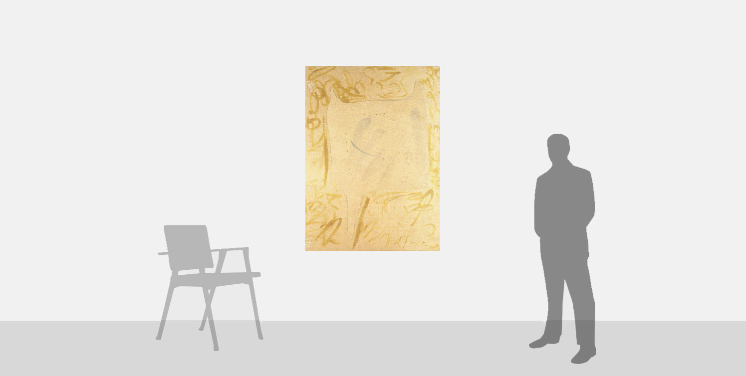 Executed in 1958, Concetto Spaziale, Forma is a significant example of Fontana’s Inchiostri as it presents all of the main characteristics of the series. Besides the use of soft tones, the work also features the presence of an irregular shape that not only is traced on the burlap base, but that is also crossed by holes and surrounded by nervous cursive-like strokes.