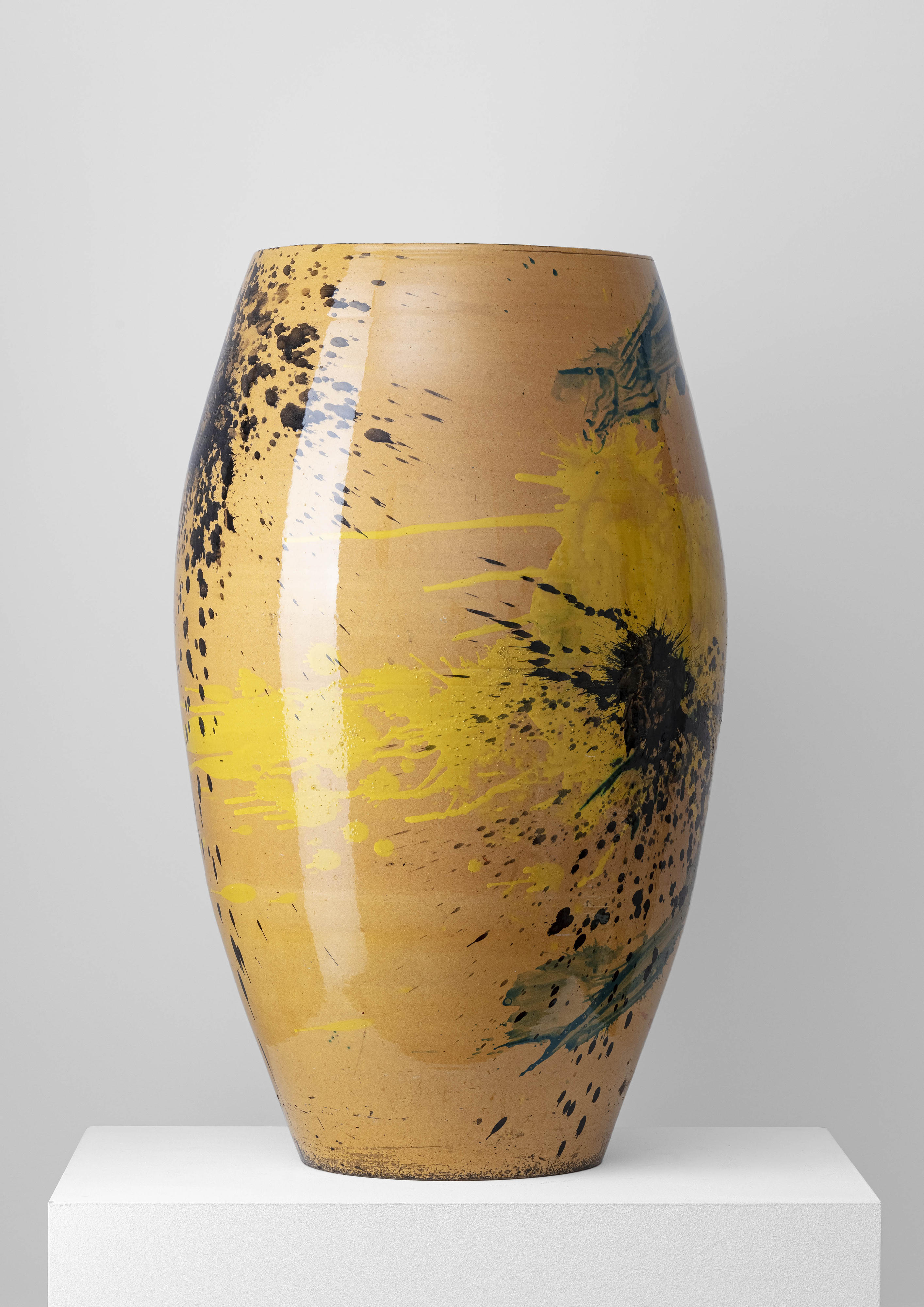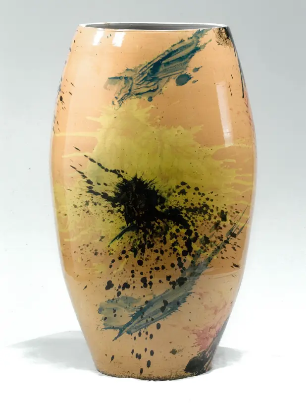 Embodying simplicity in statuesque form, the present work was created in 1952, and thus during the period when the artist was wrestling with the boundaries between figuration and abstraction. In the present work, the latter idiom has prevailed. Fontana had previously carved vases with battle scenes and hunting subjects drawn from depictions of warriors that surround the curves of Hellenistic Greek vases. Here, instead, Fontana jettisoned these motifs in favour of abstract splashes of yellow, black, blue, and red in clear homage to the groundbreaking new technique pioneered by the Jackson Pollock—Fontana has used the vase as his canvas.