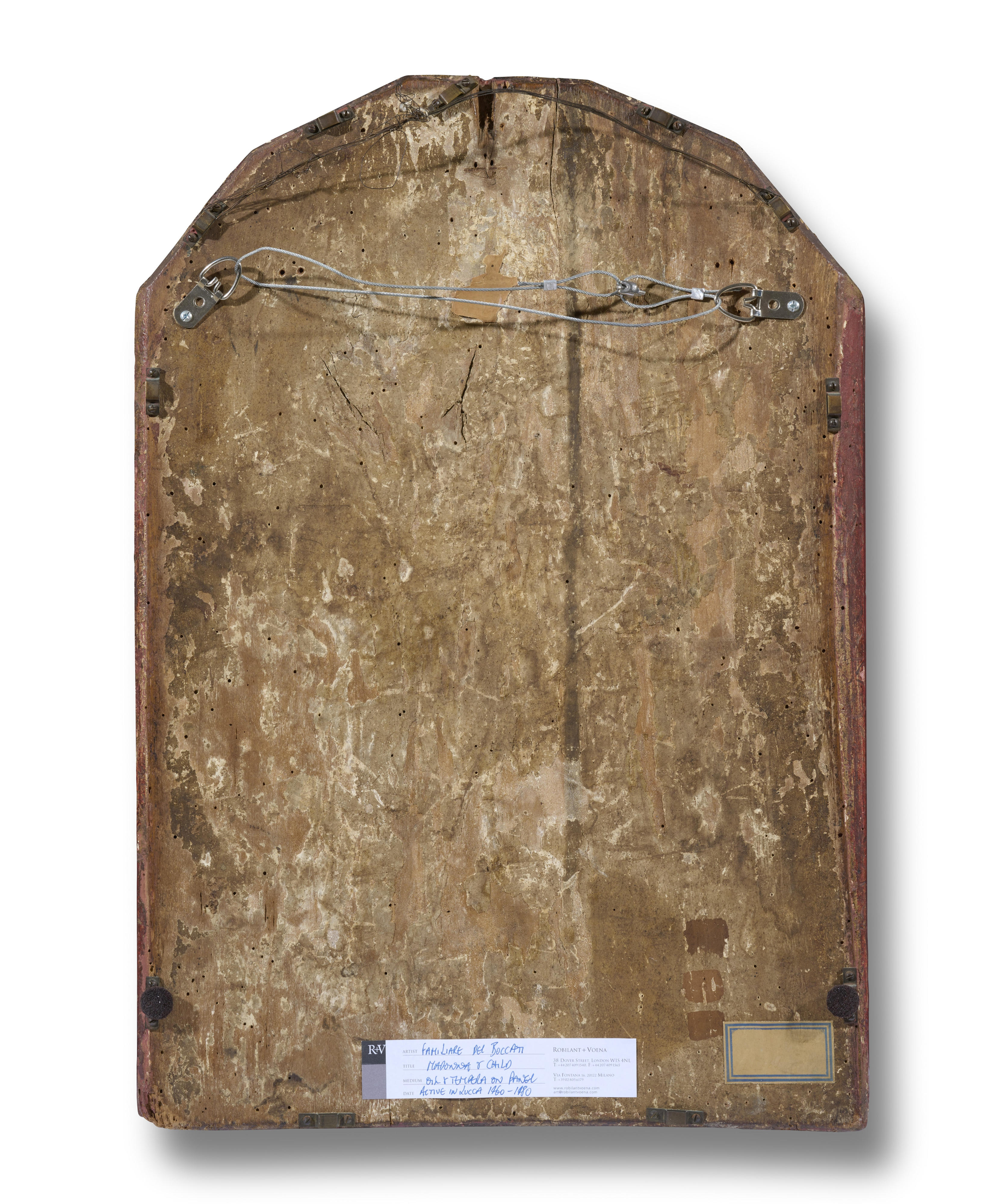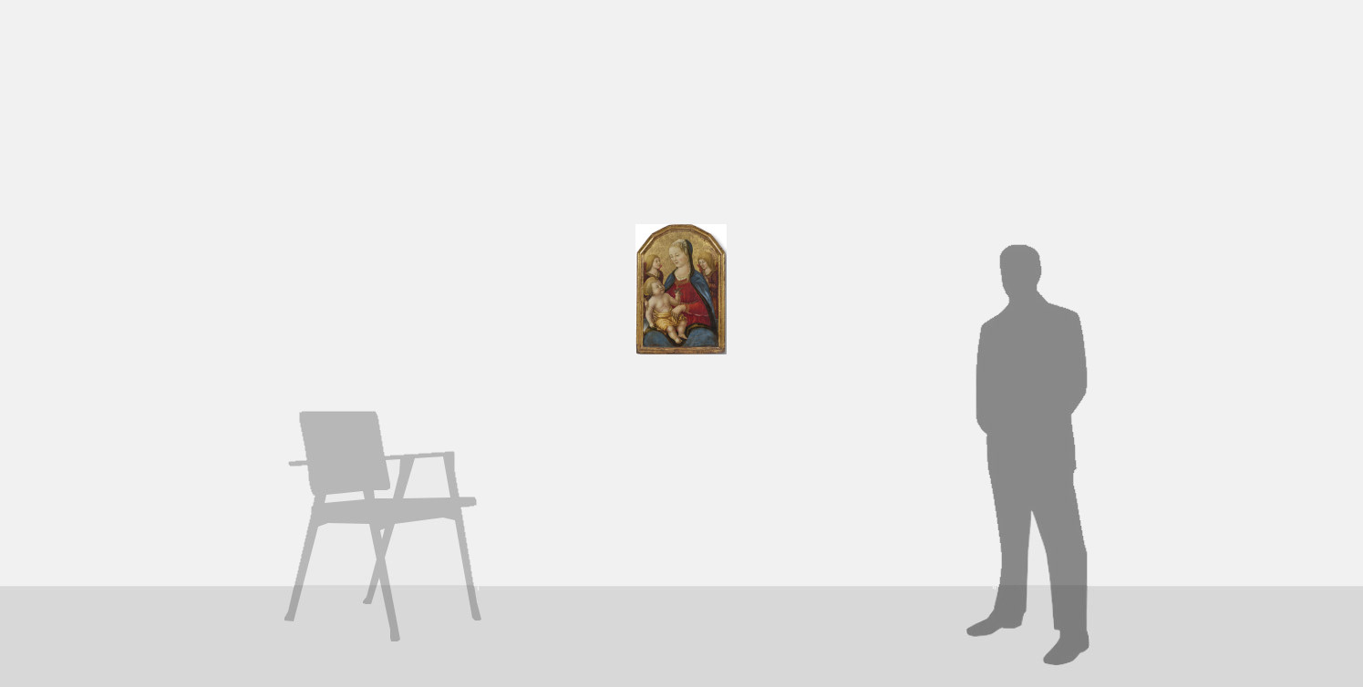 Roberto Longhi was first scholar to identify the personality of this distinct artist, dubbing him the 'Familiare di Boccati' and uniting his oeuvre which then comprised the present panel, at that time in the Umberto Pini collection, Bologna, a further Madonna and Child with Two Angels in the Louvre, Paris, a Coronation of the Virgin in the Städel Museum, Frankfurt and a Saint Sebastian in a private collection). Longhi dismissed previous attributions of the present panel to the Sienese artist Francesco di Giorgio, an opinion published by Sir John Pope-Hennessey and later reprised by Allen S. Weller in his catalogue on that artist. Pope-Hennessey believed this panel to be a later work by Francesco di Giorgio, dating it between 1471 and 1475, and rationalising the divergence in style as the consequence of its execution in a period when "Francesco di Giorgio's art takes on a new firmness and an almost academic severity of outline." He also alluded to manifestations of the influence of Fra Filippo Lippi, citing the smooth features of the Madonna, the plump cheeks of the Christ Child and the extended position of his arm as derivations in reverse of Lippi's tondo now in the Galleria degli Uffizi, Florence. There are however other stylistic peculiarities present in the panel: the sense of depth created by the perspectivally-drawn halos, most unlike the elaborately decorative designs of the Sienese artist's works, and the unusual rendering of the angels' and Christ Child's hair, falling in long, thin, vertical ringlets rather than the voluminous soft curls generally preferred by Francesco. Both qualities, thought by Weller to be progressions in Francesco's art, are instead features indicative of its execution by a different hand entirely.