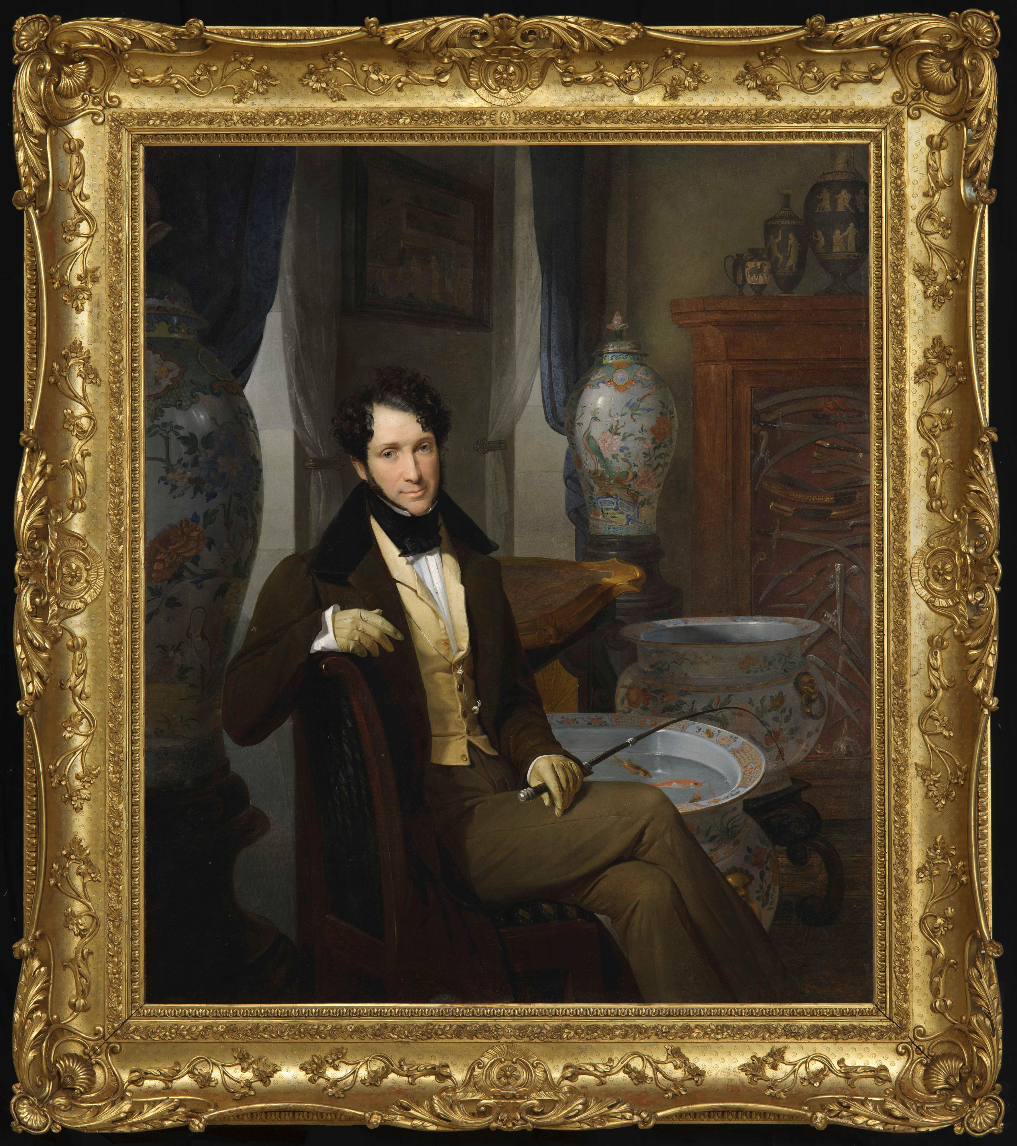 Antonio Visconti Aimi (1798–1854) was a Milanese aristocrat and a distinguished collector. Contemporary descriptions of his holdings note that he owned Old Master and modern paintings, antiquities, Chinese, and Japanese vases, arms and armour and fine furniture including at least one piece by Boulle. In Molteni’s painting, he seated in a beautifully appointed room, in which a number of large Chinese urns and basins are prominently displayed, one of which serves as a rather extravagant fishbowl.