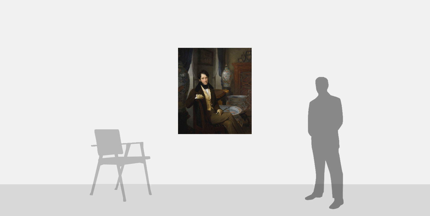 Fashions in the Romantic era were characterised by the hourglass silhouette, found in both men’s and women’s clothing. Men’s frock coats sprouted wide collars, padded shoulders and puffed sleeves, and waists were sometimes cinched and narrowed with a male version of the corset to this achieve the desired silhouette. The sitter here wears a brown frock coat with a black velvet collar and a slight puff to the sleeves, and a black cravat which prefigures the later development of the bowtie. His trousers were likely fitted with stirrups to maintain a long, lean line; by this time, full-length trousers were worn by men on all but the most formal occasions, when old-fashioned breeches and low-heeled pumps made anachronistic appearances. Although the sitter is indoors, he carries a riding crop and wears kid gloves, a fashionable accessory. His hair is curled, with long sideburns; after more than a century of clean-shaven faces, young men of the Romantic era discovered a new form of self-expression though coiffure. Indeed, as suiting became increasingly sober, men embraced more inventive hairstyles, flamboyant facial hair, and richly coloured and patterned waistcoats to lend distinction and flair to their appearance. The sitter’s crisp white shirt, eye-catching waistcoat, meticulously knotted cravat, watch fob, gloves, and riding crop all demonstrate a scrupulous attention to detailed accessories which can be found in menswear still today.