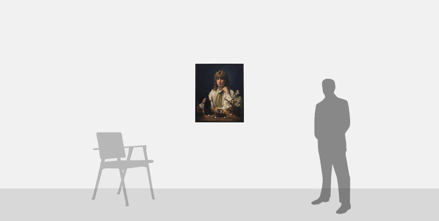 Appleby-Barr’s portraits depict his friends and acquaintances. The sitter in the present work is posed at a table in a dark, intimate setting, dramatically illuminated in a manner which recalls the distinctive chiaroscuro of Old Master painters such as Caravaggio. The costume too recalls Baroque conventions, with its billowing white shirt and swish of green silk knotted around the neck. At first glance, the gender of the sitter is not readily evident—is this beautiful androgynous figure, glowing beatifically as if from within, a slightly masculine woman, or a slightly feminine man? A clue is found in the title, which identifies the sitter as Max Kallio, pointing to the latter. Indeed, Appleby-Barr’s depiction of Max can be said to be deliberately ambiguous when it comes to his gender, a recurring theme in his work.