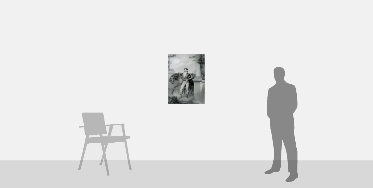 Camillo Borghese (1775–1832) was born to one of the most important families of the Roman aristocracy. A patron of the arts, Prince Borghese is most famously remembered for commissioning from Antonio Canova a full-length sculpture of his wife in the nude, as Victorious Venus. The family was known for its Napoleonic sympathies, and Camillo moved to Paris in 1796. In 1803 he married Napoleon's favorite sister, Paolina Bonaparte (1780–1825). It was a tempestuous marriage. At first, the couple lived in gilded splendor between Paris and Rome, where they refurbished the apartments of Camillo's parents in the Palazzo Borghese; however, they soon became estranged and each took lovers. Paolina was still officially at her husband's side when, in February 1808, Napoleon effectively put him in charge of Piedmont, Liguria, Parma, and Piacenza. Camillo and Paolina moved from Paris to Turin in April of that year and lived between the Piedmontese capital, Paris, and Rome. Following the fall of Napoleon in 1812, Camillo moved to Florence to distance himself from his wife and his alliance with the former Emperor, managing to avoid any of his lands being sequestered by the popes, a standard punishment for those with pro-Bonapartist tendencies. He found favour with the Grand Duke of Tuscany and enjoyed a long affair with the widow of one of his former comrades in exile, Duchess Lante della Rovere, although he was eventually convinced by the pope into taking Paolina back, only three months before she died of cancer. He continued in secret and futile Bonapartist plots until his own death in 1832. Executed in 1817, in the present work Jacob portrays the price in his prime, at the age of forty-two, freed from the manufactured magnificence of court ceremony. He is elegantly posed, standing self-possessed and dignified beside a magnificent stallion which has kicked dust over one of his boots, the Borghese arms on the wall above the artist’s inscription.
