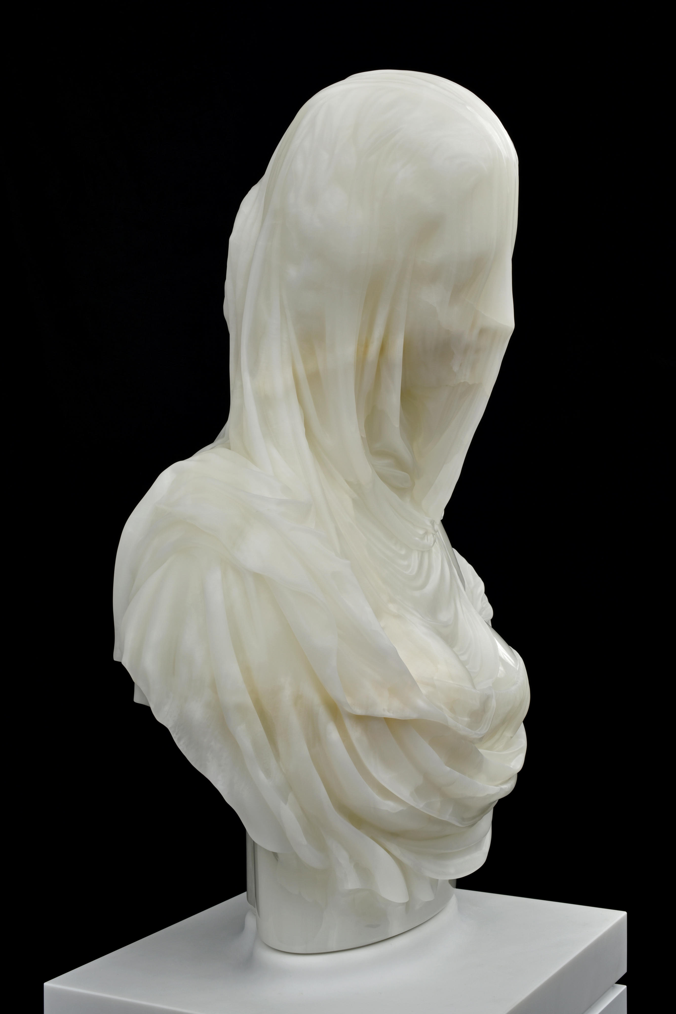 Straying from the traditional medium of white marble, the sculpture uses semi-transparent stones atypical of what would have been used in Baroque Italian sculpture, invigorating the figure with an element of sumptuous softness. The cloth appears delicate, almost seeming that the slightest breeze would cause the folds to move – at odds with its rigid medium. In contrast to the seemingly sheer stone of the drapery, the figure’s exposed shoulder is lustrous, distinguishing flesh from cloth. This reimagined personification of Purity is ethereal, juxtaposed between resounding stillness and an elegant dynamism.