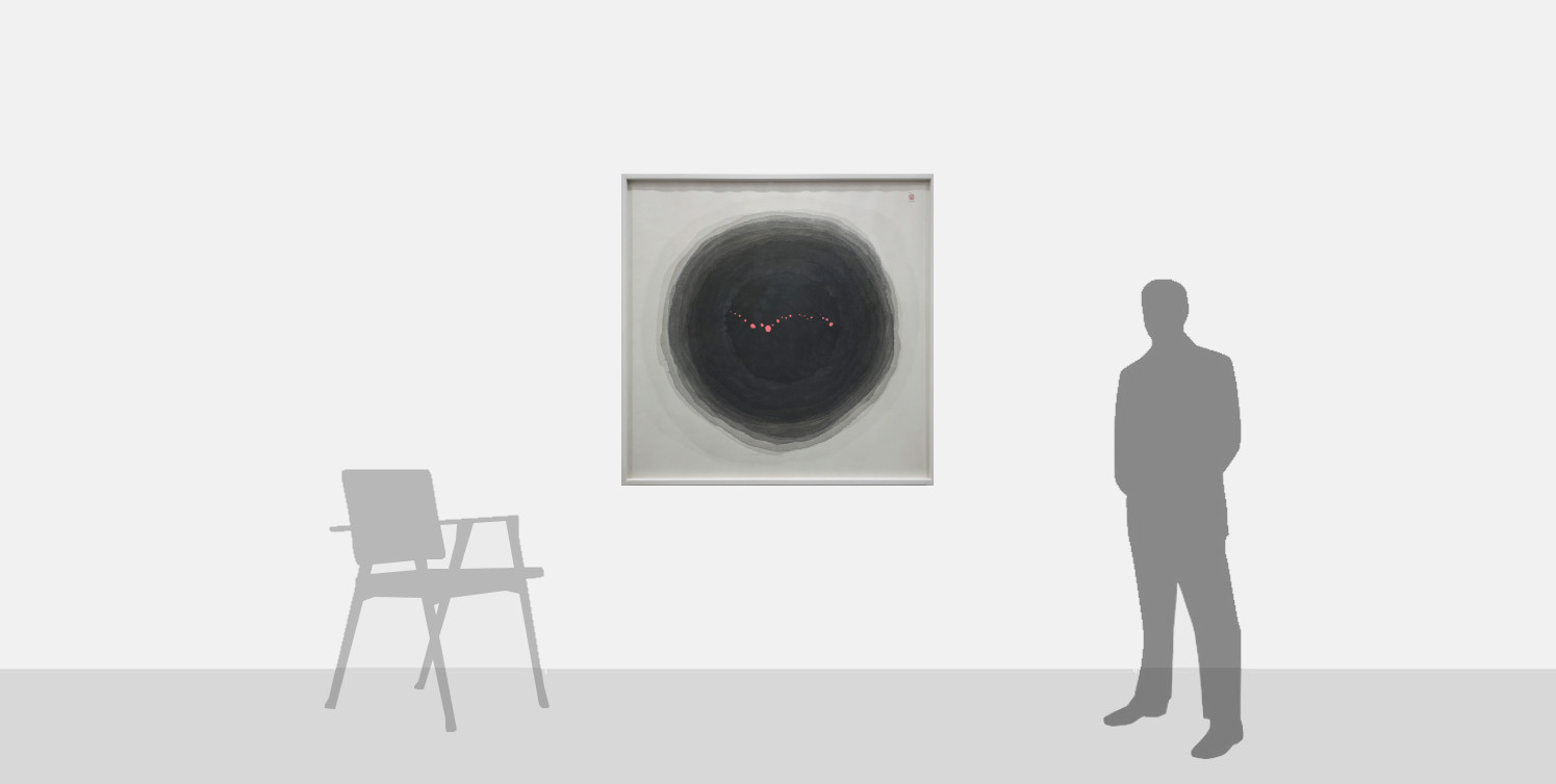 Percussion encapsulates many aspects of Kim's practice, both physically and thematically. The work is made using the artist's signature method of applying ink onto mulberry Hanji paper, the edges of which she then precisely burns using matches and incense sticks, before layering these pieces of paper to create her desired composition. Here, the discs of burnt paper are layered to create a gradual transition from light to intense dark, radiating inversely from the centre. A musical arrangements of small red fragments of paper dance across the centre of the composition. Percussion achieves a union of poles, that Kim seeks within her practice: matter and void, movement and stasis, light and dark, individuality and cohesion.