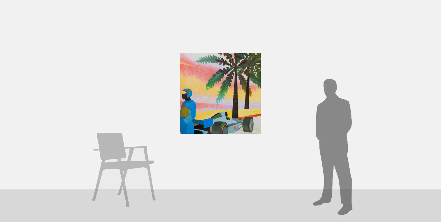 Many of Watson's paintings focus on Black protragonists undertaking aspirational leisure activities and sports, such as skiing, horseriding and motorsports. The present work, Pon the left hand side, depicts a Black racing driver in an ethereal, dreamlike setting. By placing the figure in this role, Watson emphasises the role of traditionally sidelined groups and individuals in such luxury pastimes and professions, offering a vision of what is possible when opportunities are open to all.