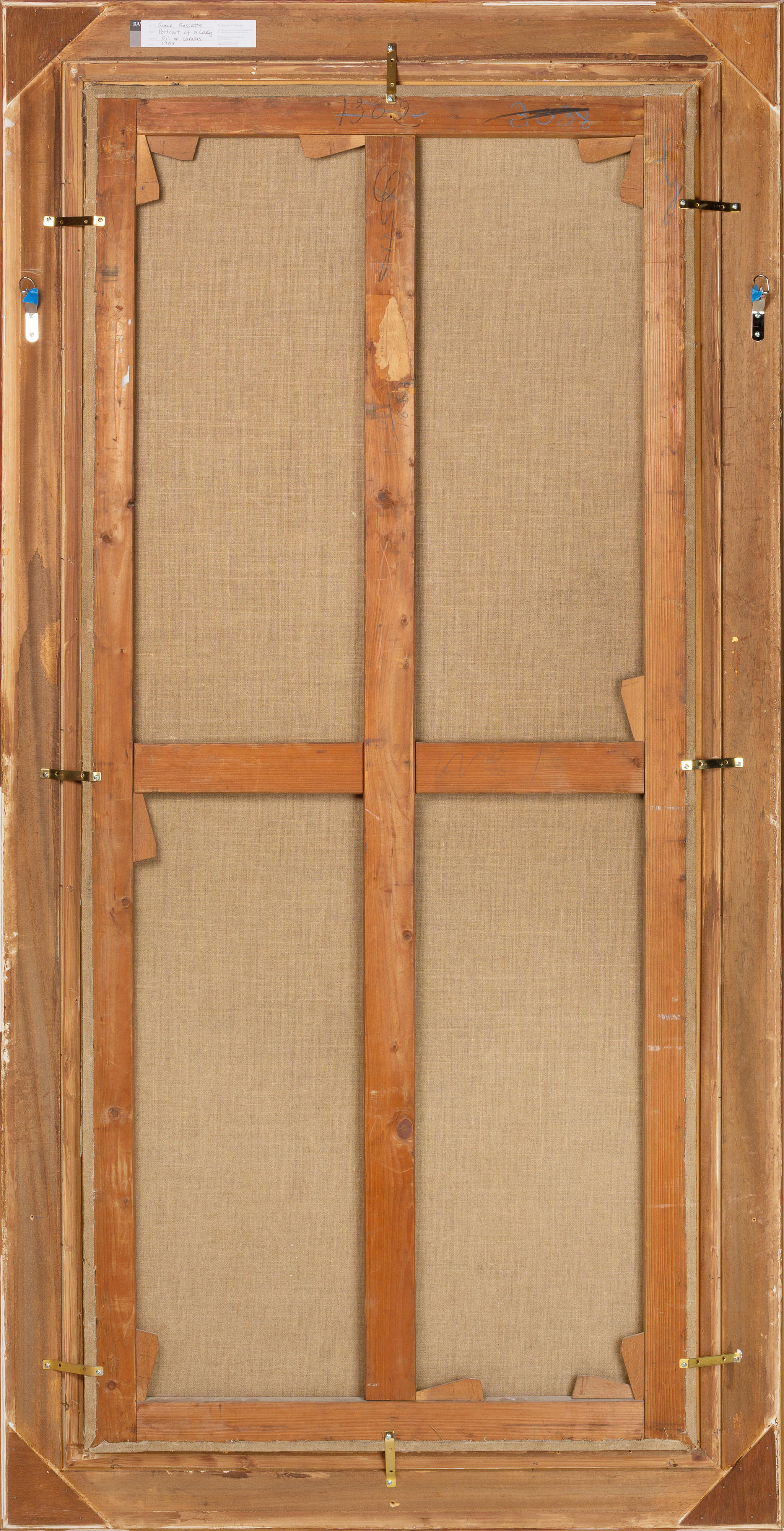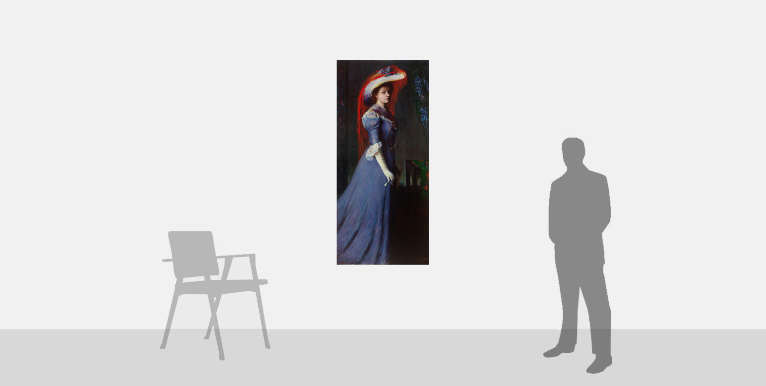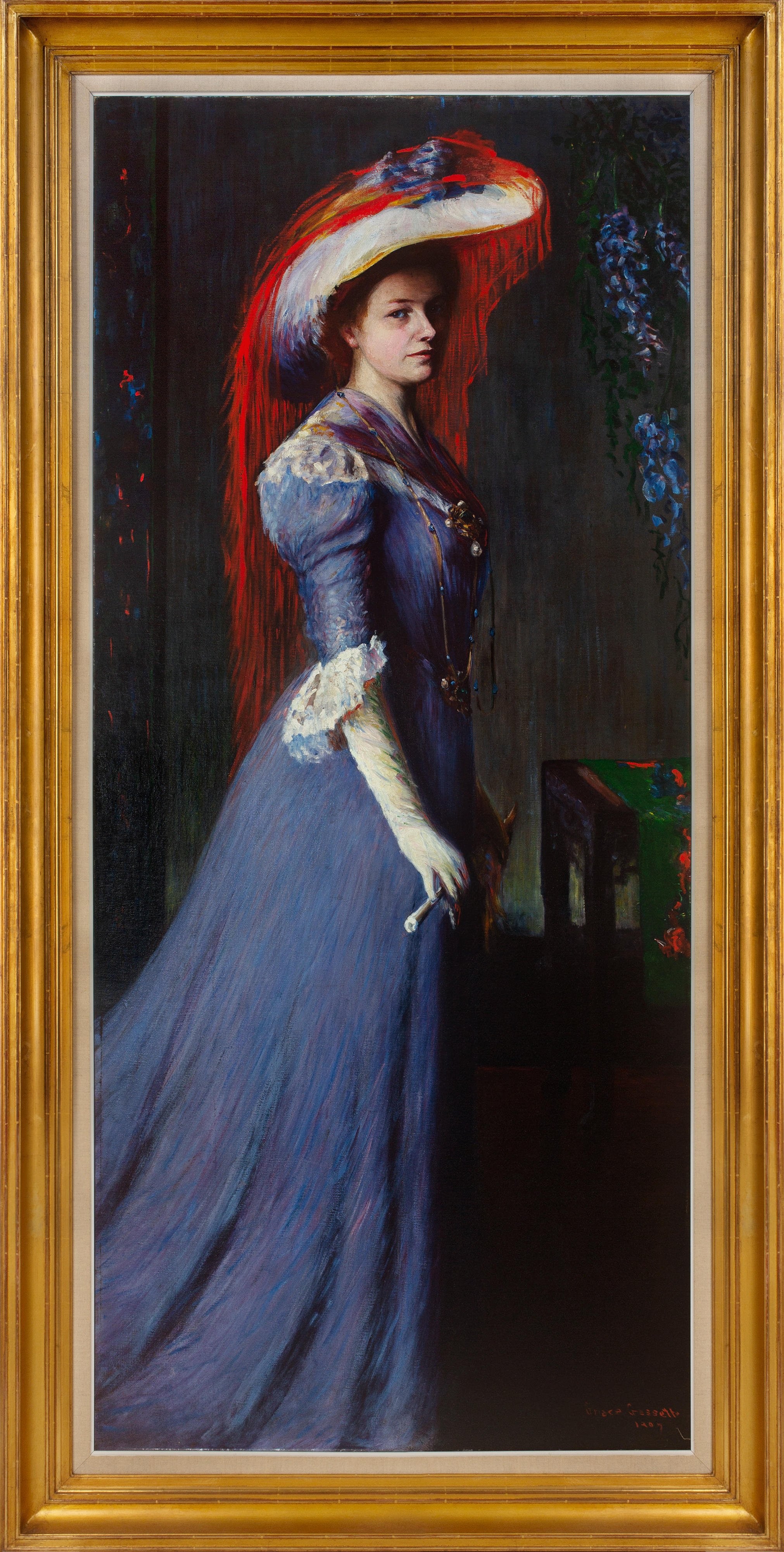 This elegant portrait of a young woman by Gassette is signed and dated 1907. The sitter is shown full length, wearing a blue gown, long white gloves, and a wide white and blue hat from which spills a brilliant red veil. She holds a parasol. Wisteria at the upper left complements the purple of her costume, while a Chinese table in the background was the height of fashion in Paris in this period. Although the sitter has not yet been identified, it is tempting to hypothesise, given the ambitious scale of the portrait and the prominence of the signature and date, that the painting is the one Gassette submitted to the Carnegie International in that year, the elusively-titled 'portrait of Madame A.'