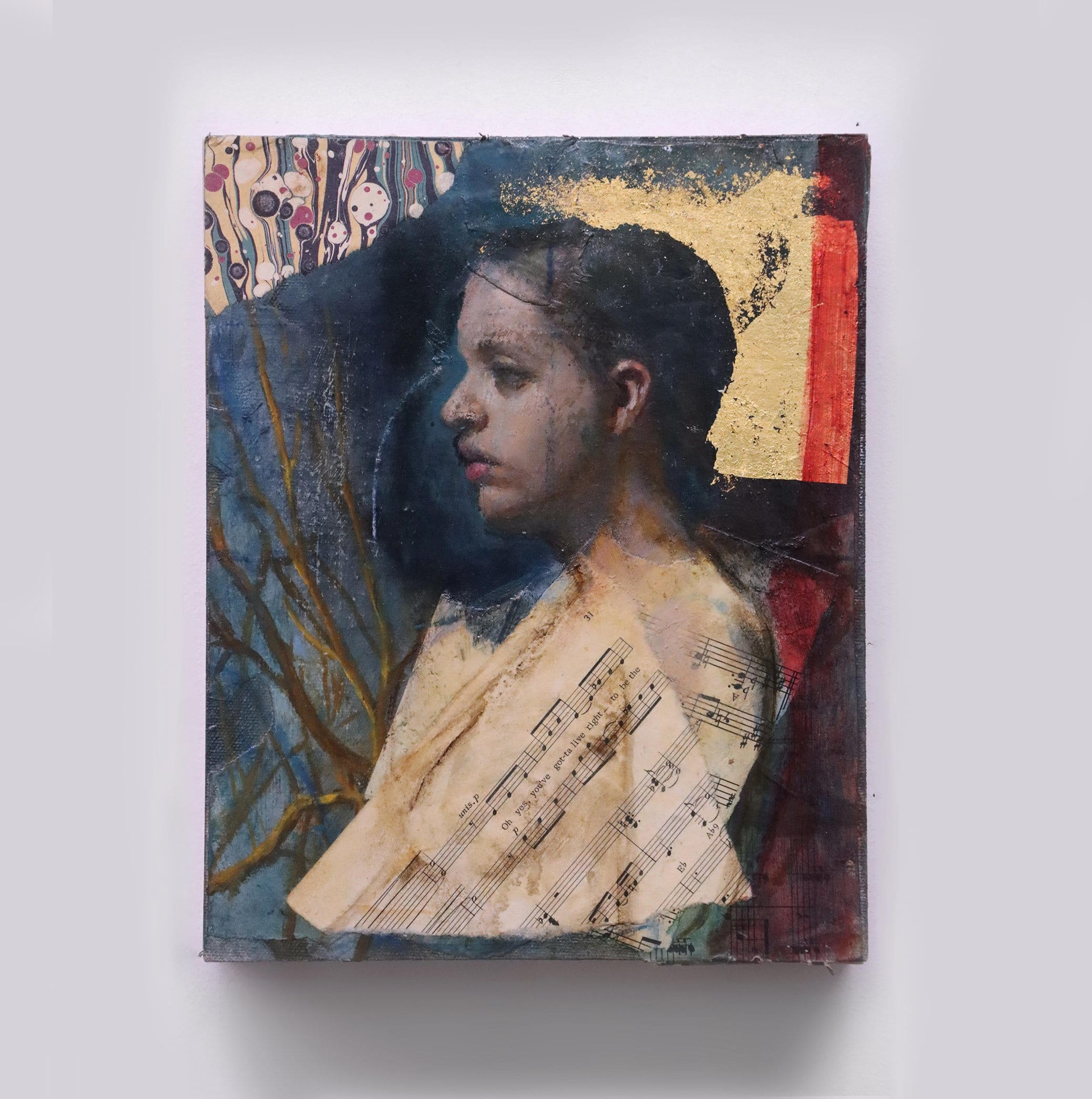 Oil on paper collage with 24K gold leaf on panel