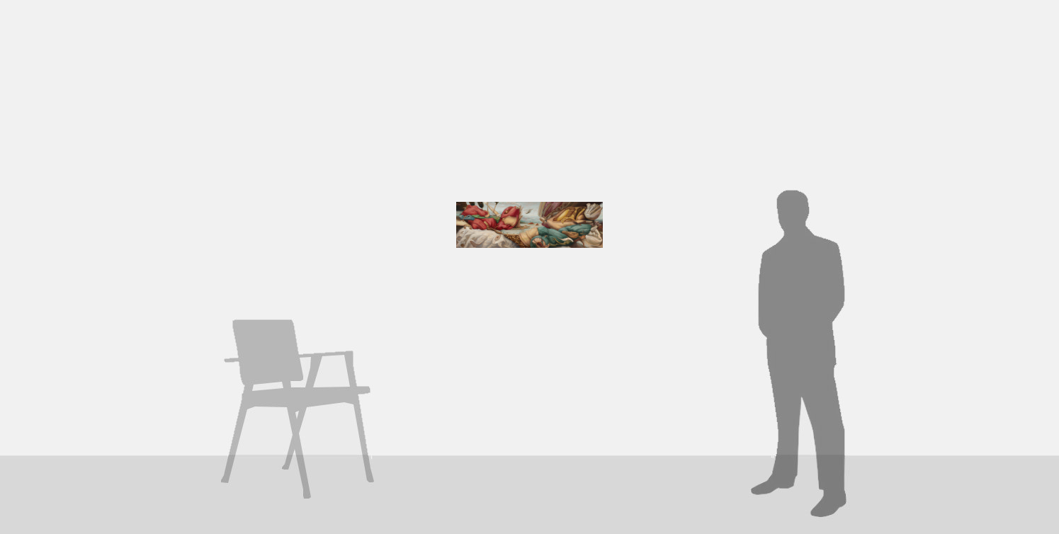 Santos’ inspirations are drawn from the more awkward or subversive corners of art history, such as Old Masters who were the eccentrics of their era, such as Giuseppe Arcimboldo, or those whose style was at odds with conventional beauty, such as El Greco or Francisco Goya. Further, his paintings take influence from the fleshy forms of Peter Paul Rubens and the expressive grandeur of Michelangelo and Raphael.