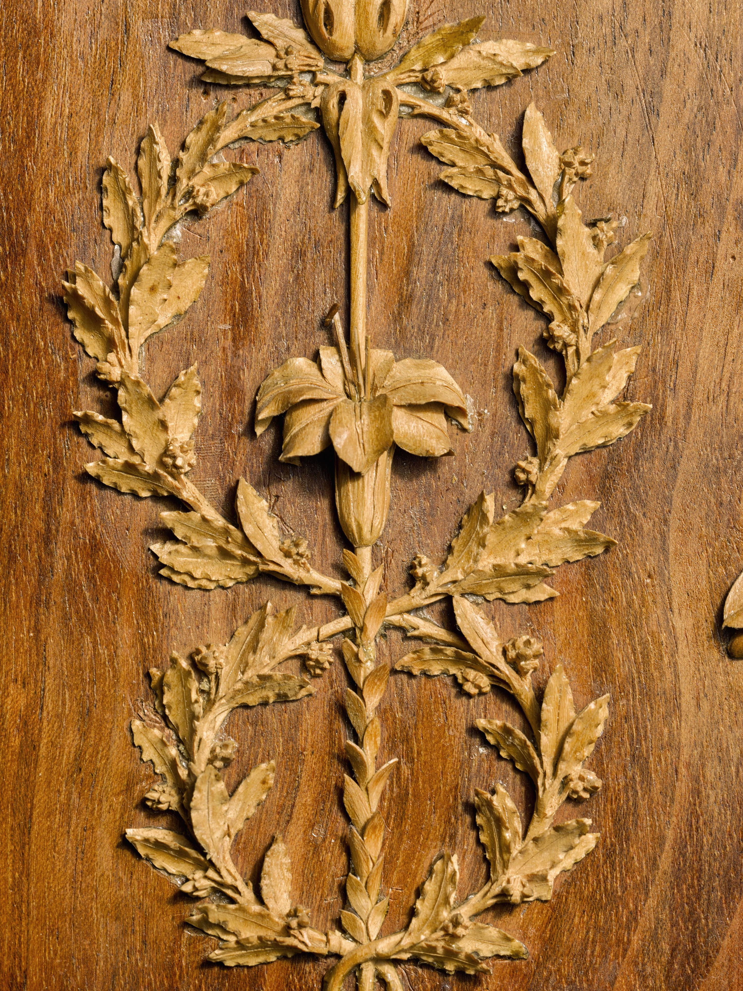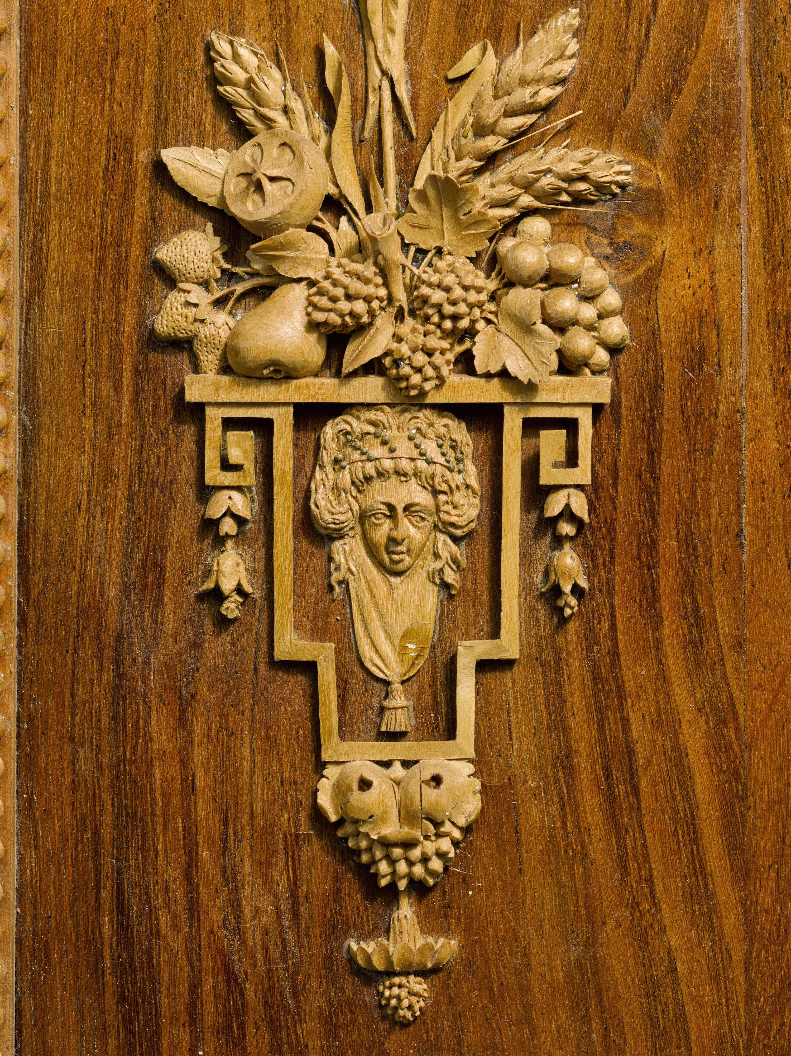 This exquisitely carved panel offers an extraordinary self-portrait of the Piedmontese furniture-maker, sculptor and ornamentalist Giuseppe Maria Bonzanigo (1745–1820). Bonzanigo heralded from a family of wood-carvers and organcase-makers in Asti, and in 1773 he began working for the Savoy family. Over the course of the ensuing decades, he is documented supplying countless stools, chairs, armchairs, benches, sofas, screens, prie-dieux, beds, mirrors, chests-of-drawers and ornamental panels for the Palazzo Reale in Turin, as well as for the royal residences at Moncalieri, Rivoli, Stupinigi, Venaria and Govone. In concert with teams of architects and assistants, Bonzanigo was commissioned to decorate and furnish entire rooms in the palaces of the Savoy, with a particularly fine example being the State Rooms of the queen and king at Stupinigi. Stylistically his work marks a departure from Franco-Piedmontese traditions of inlay and marquetry cabinetmaking in favour of a more predominant use of carving. Bonzanigo embraced neoclassical forms in their most elegant expression, and his works are invariably distinguished by an ornate profusion of finely carved garlands, emblems and trophies carrying complex symbolic, allegorical and commemorative significance.
