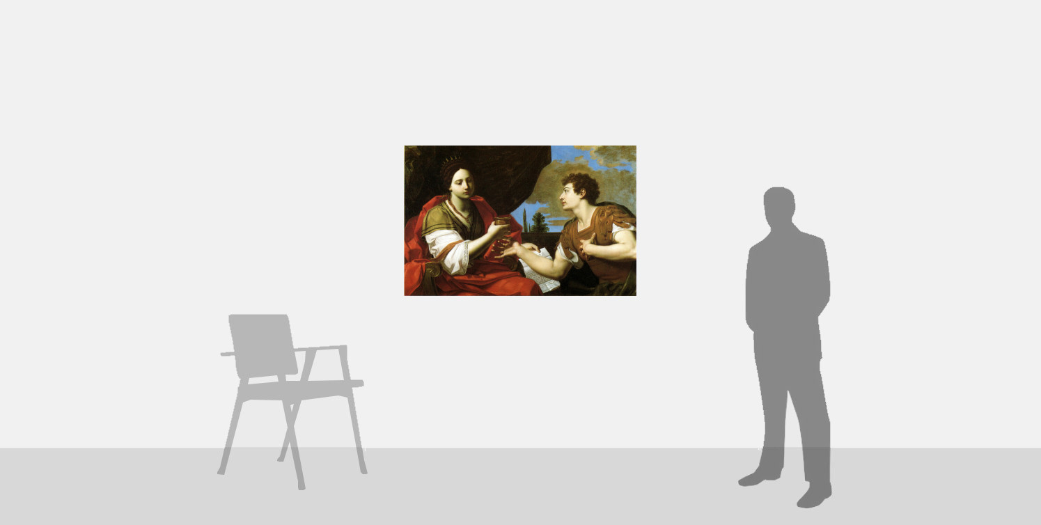 Cottino dates Sophonisba receiving the poison from Masinissa to the second of Desubleo’s Bolognese sojourns – between 1646 to 1652 – a period distinguished by the painter’s use of idealised figures clearly influenced by the Emilian School. By this time, the artist had already received significant patronage, including the Tancredi and Erminia painted for Grand Duke Lorenzo de'Medici, and Biblical subjects commissioned by the Colonna and Giustiniani. Cottino described Sophonisba receiving the poison from Masinissa as ‘one of the most successful works along classical models painted by Desubleo.’ The traditional composition, excellent draughtsmanship and the emotion expressed by the characters, combines harmoniously with the model’s obvious beauty. The work was clearly inspired by a similar subject by Simon Vouet (fig. 2, now in the Kassel Museum): the analogy is evident in the arrangement of the figures, in the position of the right arm of the protagonist and, above all, in the delicate play of hands around the cup of poison.