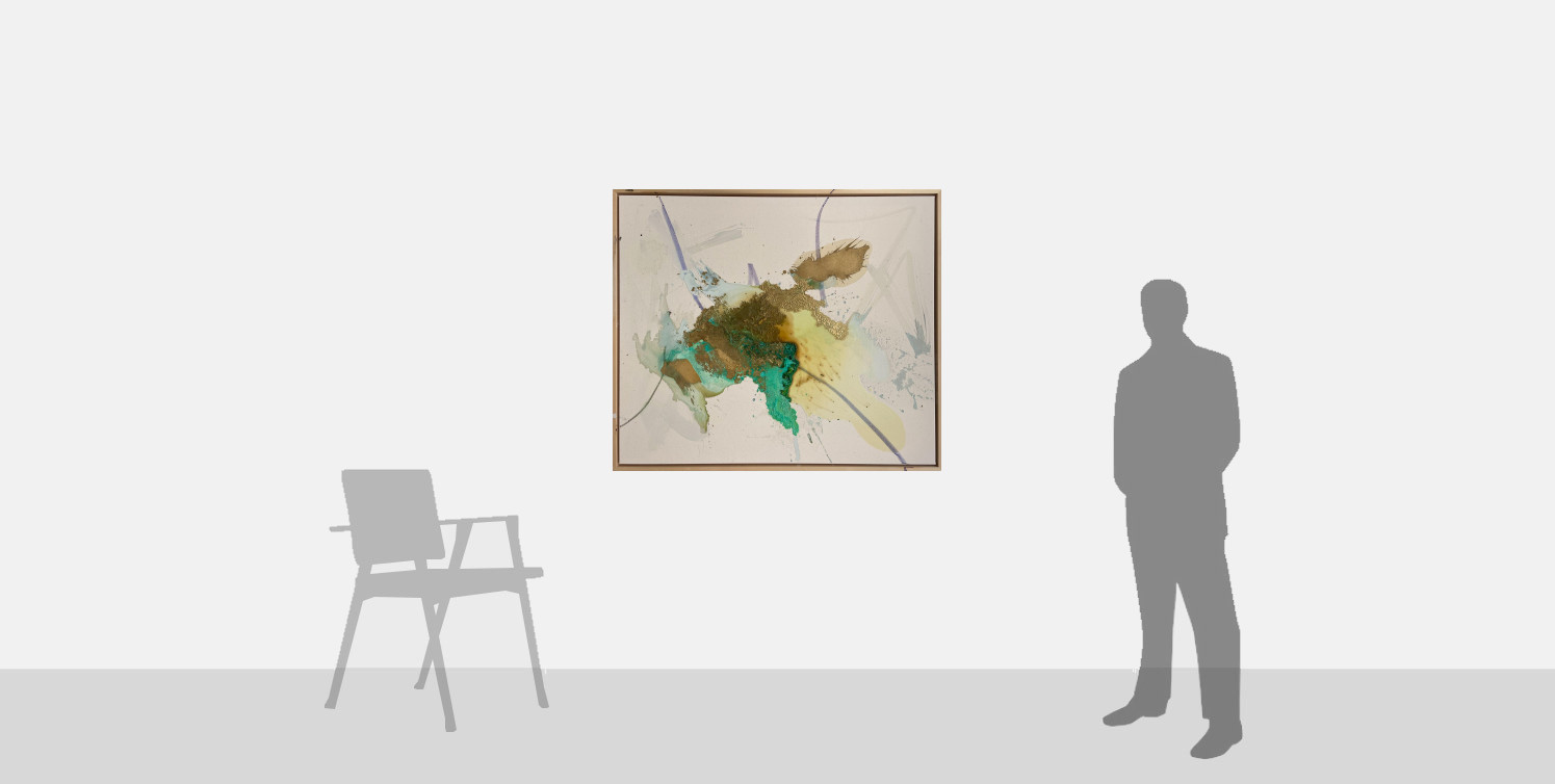 This painting takes inspiration from Naha on the Hawaiian Island of Lanai. The varied palette of the work conveys the richness of the environment, evoking the golden beaches, the aquamarine ocean and the gentle movement of boats, birds and currents surrounding the island. The textured surface, particularly of the gold and yellow paints, also reflects the physicality of the sand that is such a key feature of the island.