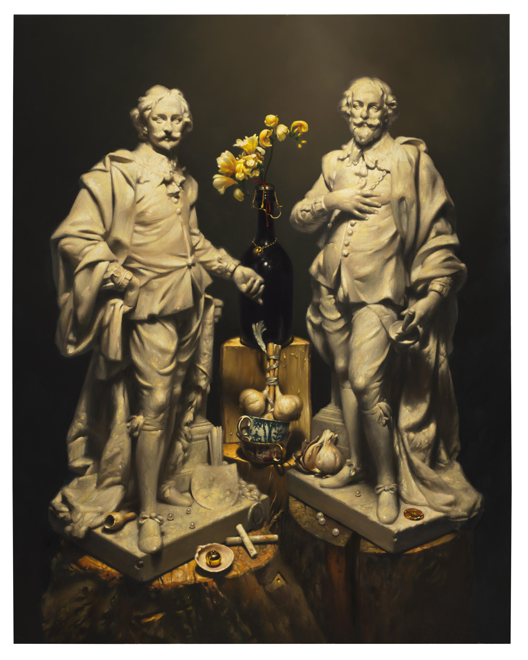 The two master painters have been subsumed into Appleby-Barr’s allusive painterly universe, mounted atop roughly textured wooden blocks, and surrounded by his signature assemblage of scattered objects. Their prominent and deliberate positioning recalls the attributes of martyred saints, or the symbolic plants and animals found at the feet of religious figures in old master paintings. Appleby-Barr’s objects resist fixed meaning, sending viewers on a postmodern chase for deferred significance. They hint at symbolism as well as echoing the colour and texture of the two sculptures.
