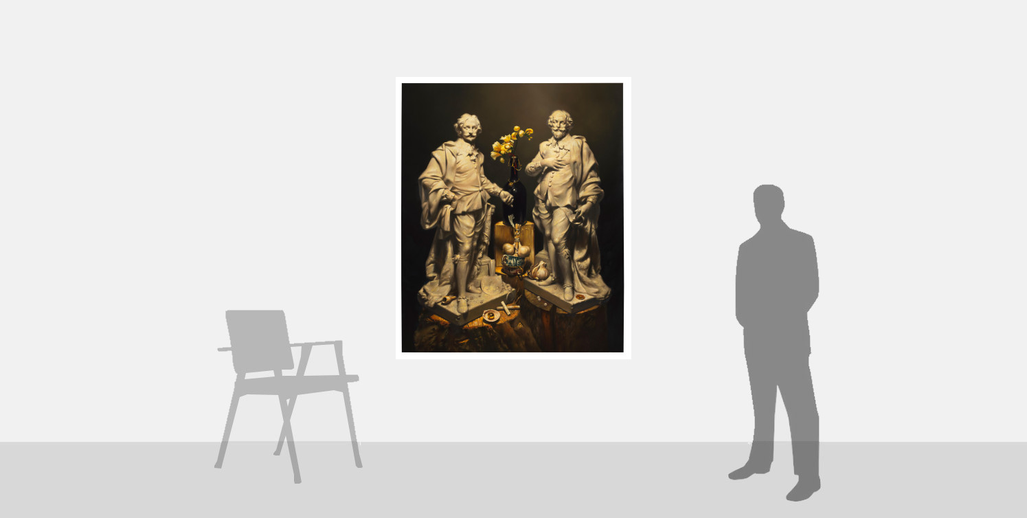 This striking painting poses statues of Anthony van Dyck and Peter Paul Rubens as if engaged in conversation. Appleby-Barr came across the two figures, by the eighteenth-century Flemish sculptor John Michael Rysbrack, in a private collection and was immediately drawn to the way they complement one another, the positioning of their limbs and the cant of their bodies forming a harmonious composition.