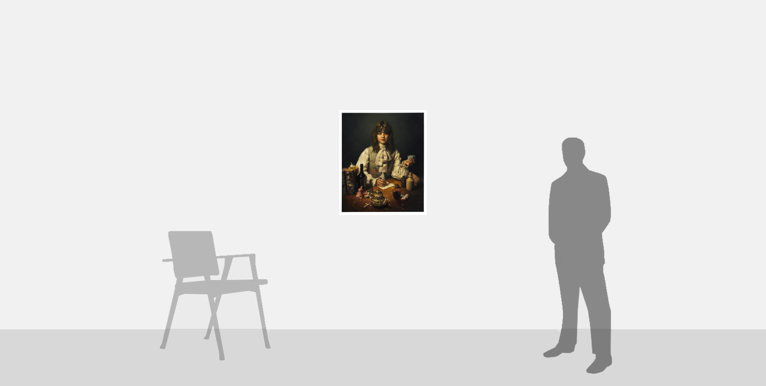 Appleby-Barr’s masterly evocation of texture and surface is much in evidence here. The viewer’s eye moves from the curling bark of the birch logs to the glinting reflections on the bottles and wine glass. The papery skin of the garlic bulb echoes the material of her shirt, as well as her quill and the paper she is writing on.